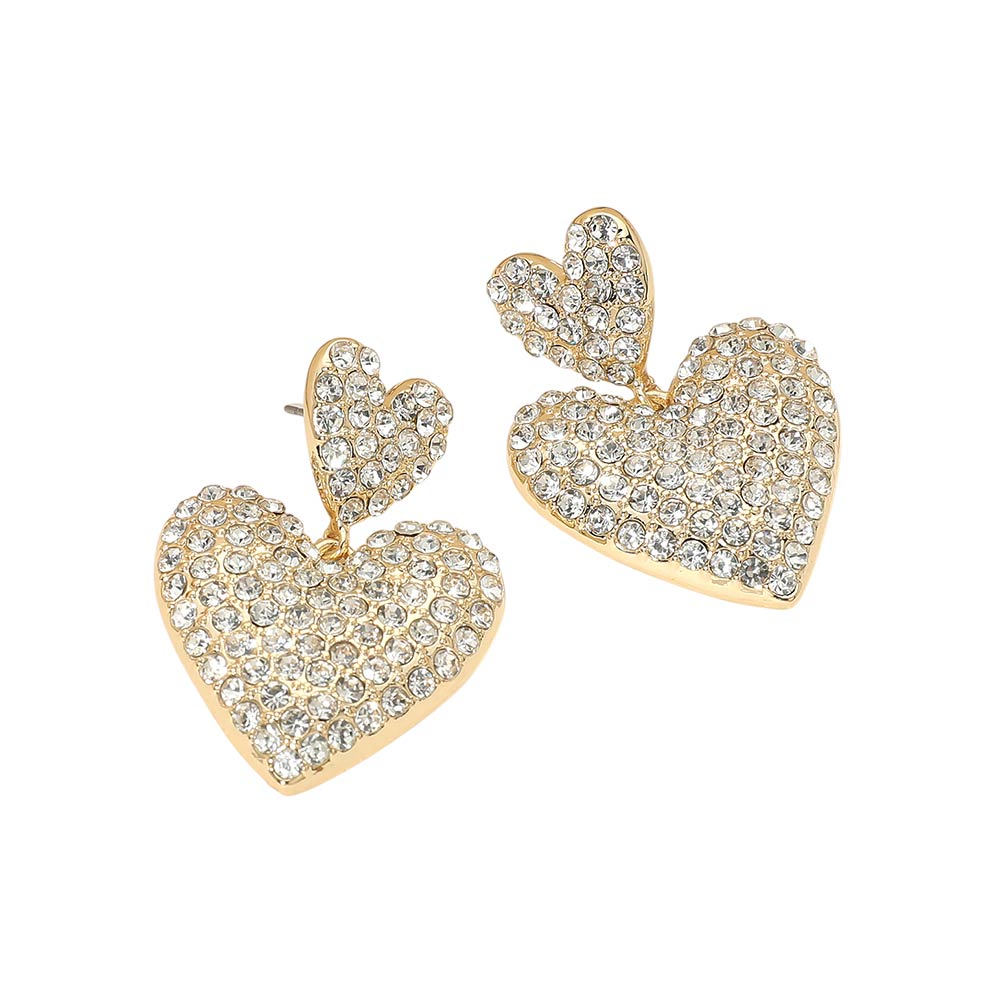 Details • Size : 1.25" X 1.75" • Post Back • These double heart drop stud earrings feature layered heart shapes detailed with sparkling crystal accents for an elegant statement look. Designed to add shine and dimension, they are perfect for everyday styling, romantic outfits, gifting moments, and boutique collections seeking eye-catching yet wearable heart-inspired jewelry. • Lead and Nickel Compliant • Gold Dipped