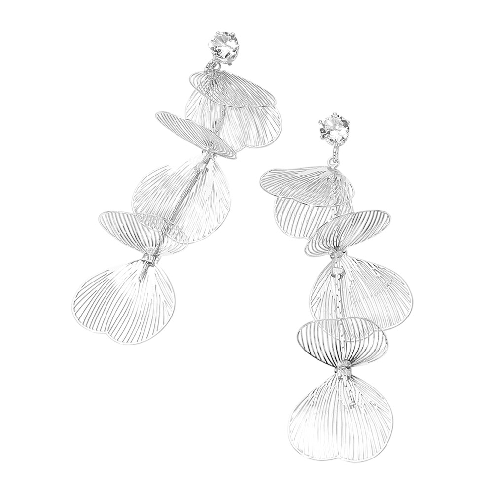 Details • Size : 0.8" X 2.75" • Post Back • Elegant multi layer drop statement earrings featuring a cascading sculpted design with airy openwork shapes and a refined crystal accent. Designed to create movement and dimension, these earrings elevate everyday outfits and special occasion looks with a bold yet graceful silhouette. Ideal for customers seeking modern statement drop earrings with a lightweight feel and eye-catching detail. • Lead and Nickel Compliant