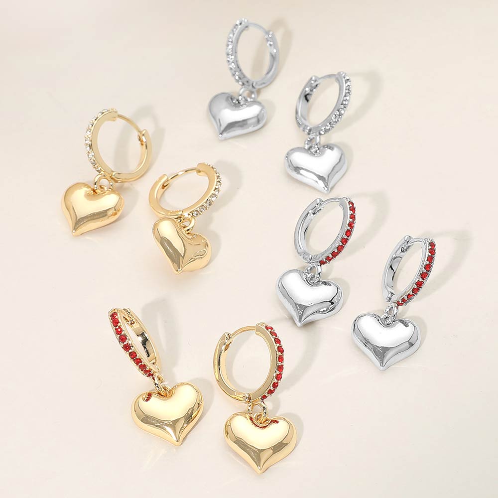 Gold Dipped Heart Charm Drop Dangle Stone Pave Huggie Hoop Earrings