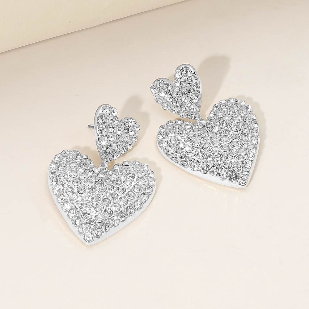 Details • Size : 1.25" X 1.75" • Post Back • These double heart drop stud earrings feature layered heart shapes detailed with sparkling crystal accents for an elegant statement look. Designed to add shine and dimension, they are perfect for everyday styling, romantic outfits, gifting moments, and boutique collections seeking eye-catching yet wearable heart-inspired jewelry. • Sterling Silver Dipped • Lead and Nickel Compliant