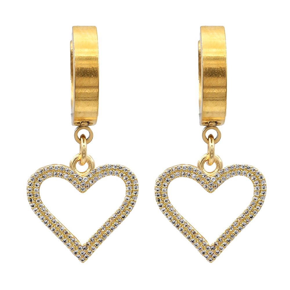 Stainless Steel CZ Stone Paved Open Heart Charm Dangle Huggie Earrings