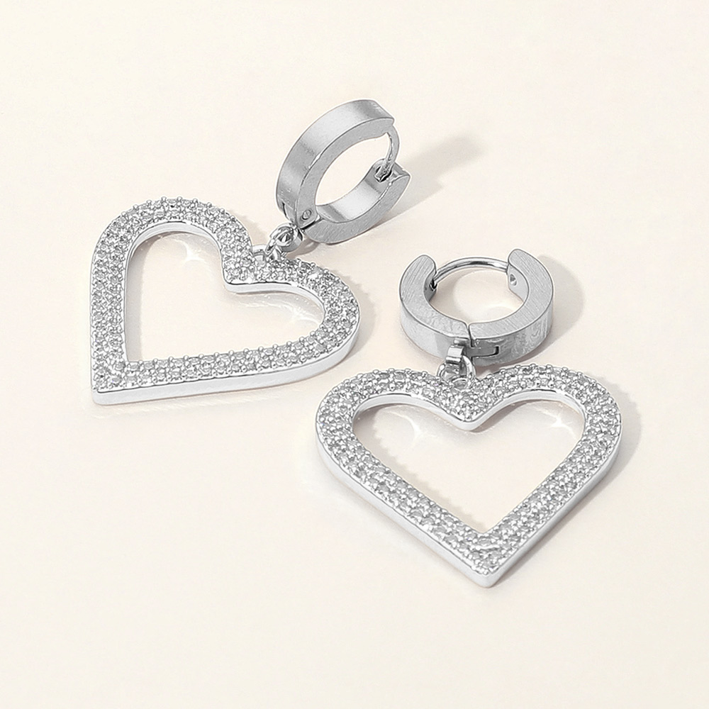 Stainless Steel CZ Stone Paved Open Heart Charm Dangle Huggie Earrings