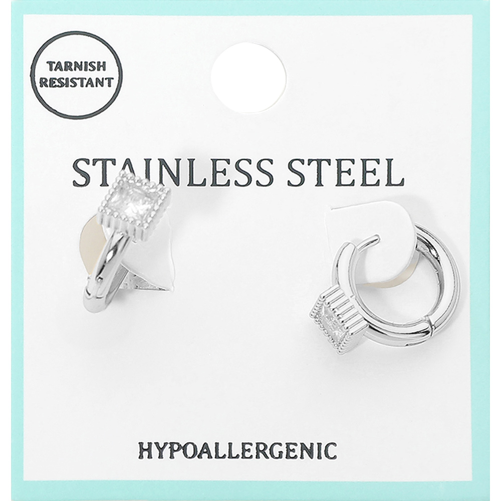 Stainless Steel Square Stone Accent Mini Huggie Hoop Earrings