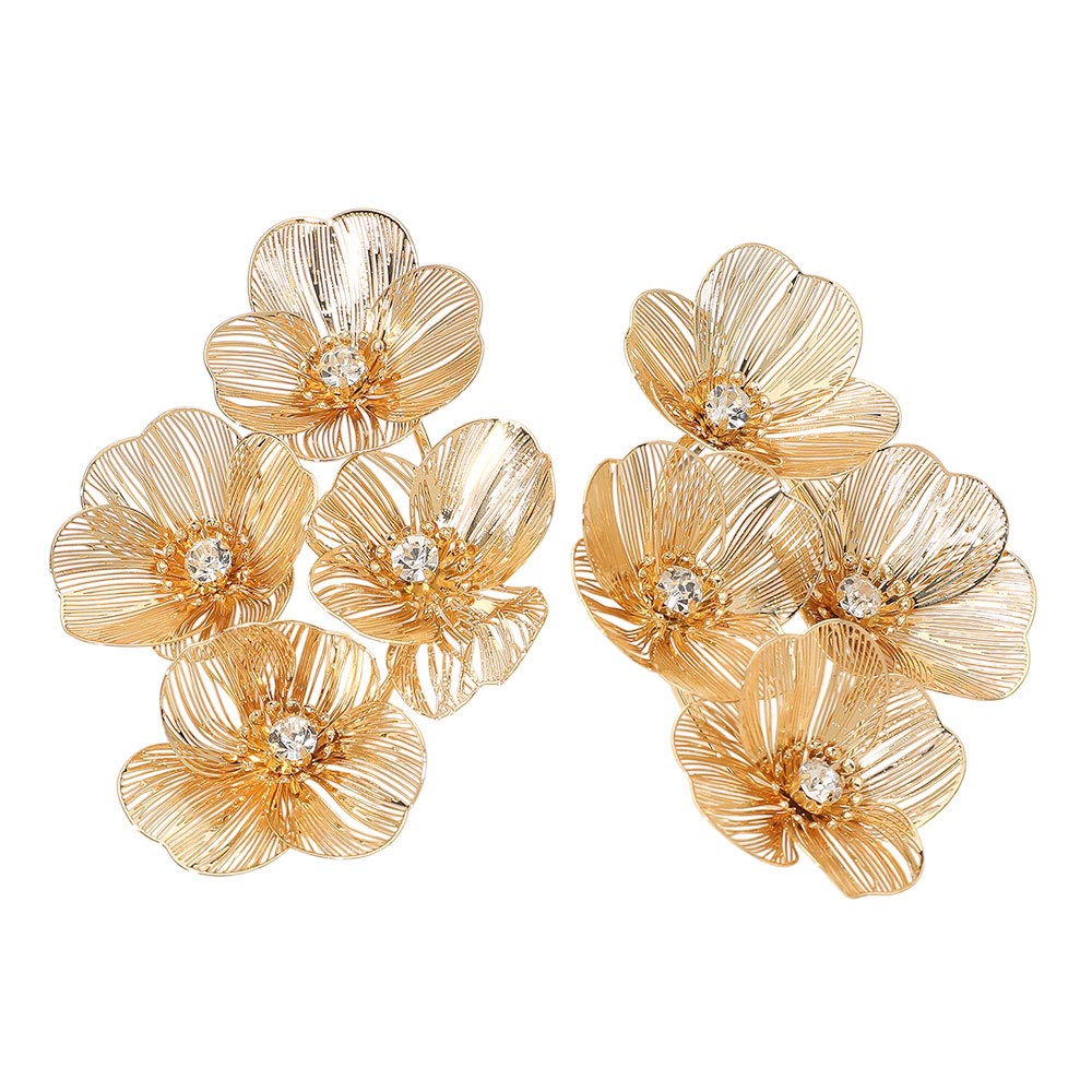 • Statement earrings featuring layered openwork petals in a blooming floral design. Each flower is accented with a sparkling crystal center, creating a sculptural look that blends elegance and artistry—perfect for elevating both evening and special occasion styles.