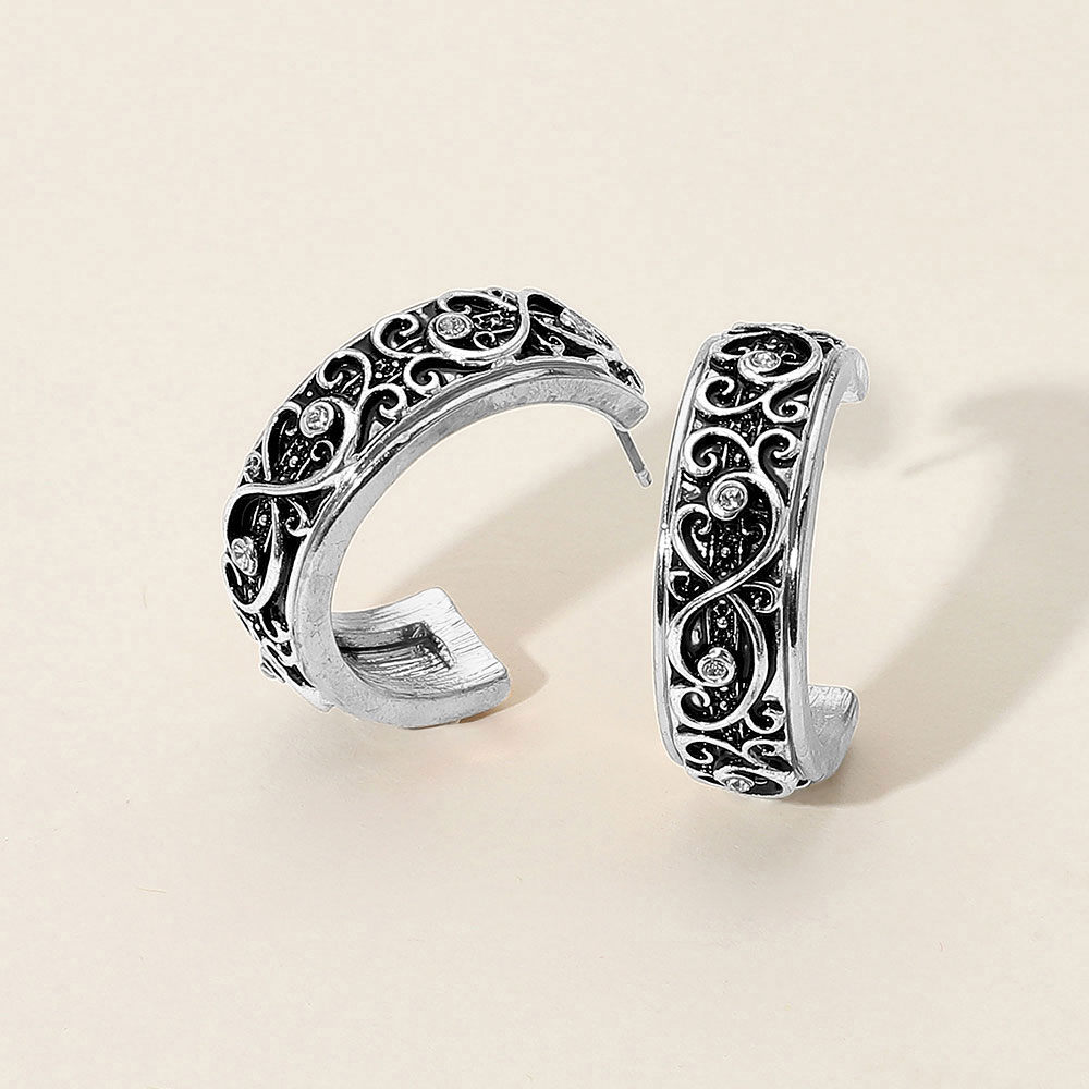 Details • Size : 1.2" X 1.2" X 0.4" • Post Back • Elegant open hoop earrings featuring intricate filigree patterns with sparkling accents and a dual-tone finish. A timeless accessory perfect for adding sophistication to both casual and formal looks. • Lead and Nickel Compliant
