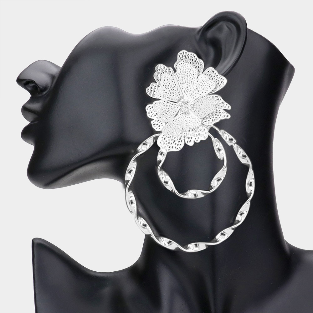 Details • Size : 2.25" X 3.5" • Post Back • Elevate your style with these elegant floral hoop statement earrings featuring a delicate flower accent paired with bold, twisted drop hoops for striking visual contrast. Designed for standout sparkle and everyday comfort, they transition seamlessly from casual wear to evening looks and make a chic, gift-ready accessory. • Lead and Nickel Compliant