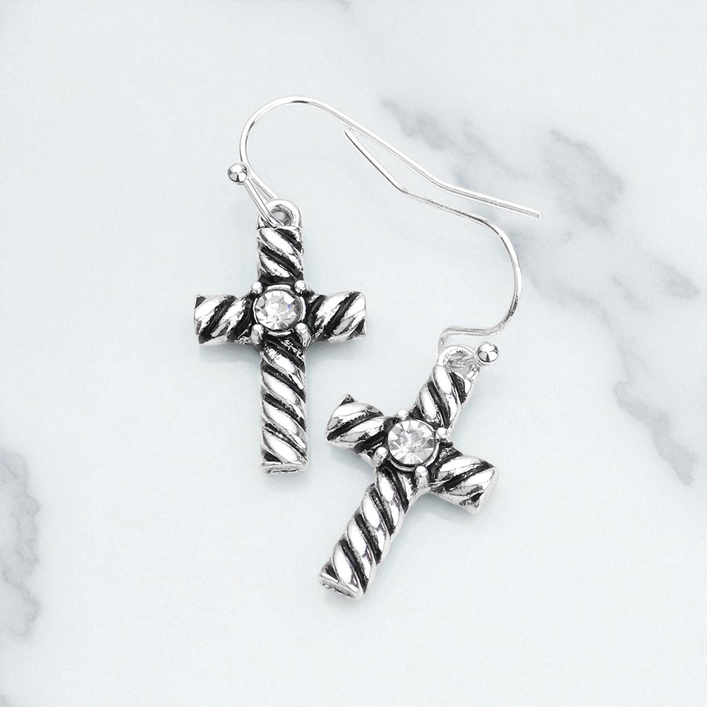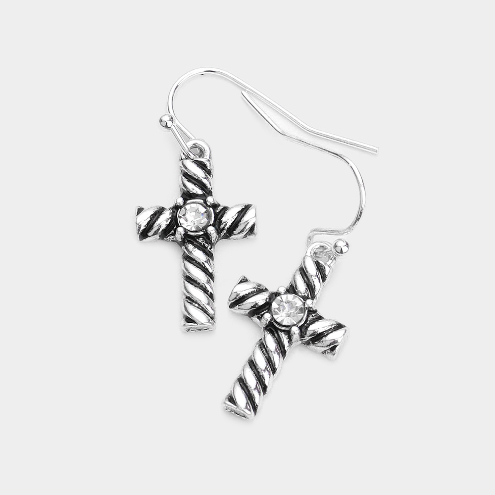 Stone Embellished Antique Metal Cross Dangle Earrings