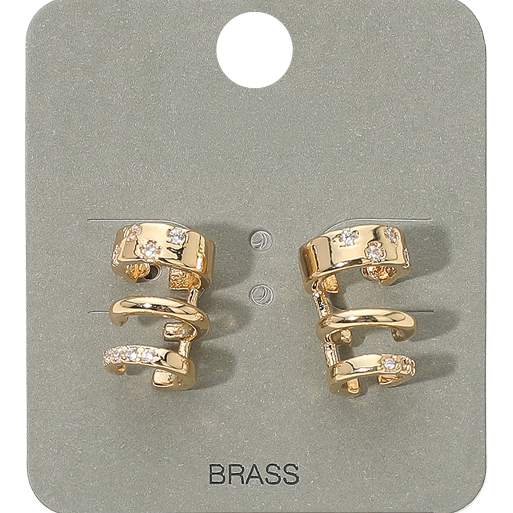 Details • Size : 0.4" X 0.6" • Post Back • Trendy ear cuff earrings featuring a stacked triple hoop design accented with sparkling crystals. A versatile and modern accessory that adds bold elegance to casual looks, parties, and evening outfits. • Brass • Lead and Nickel Compliant