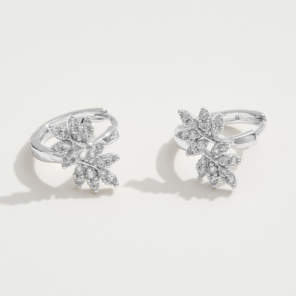 Details • Size : 0.5" X 0.6" X 0.5" • Huggie Back • Radiant and refined, these hoop earrings showcase a sparkling cluster of CZ stones arranged in a delicate leaf design. Their nature-inspired elegance adds charm to everyday wear or evening looks, making them a graceful and versatile statement accessory. • Brass • CZ Cubic Zirconia • Gold Dipped • Hypoallergenic • Lead and Nickel Compliant • Made In Korea