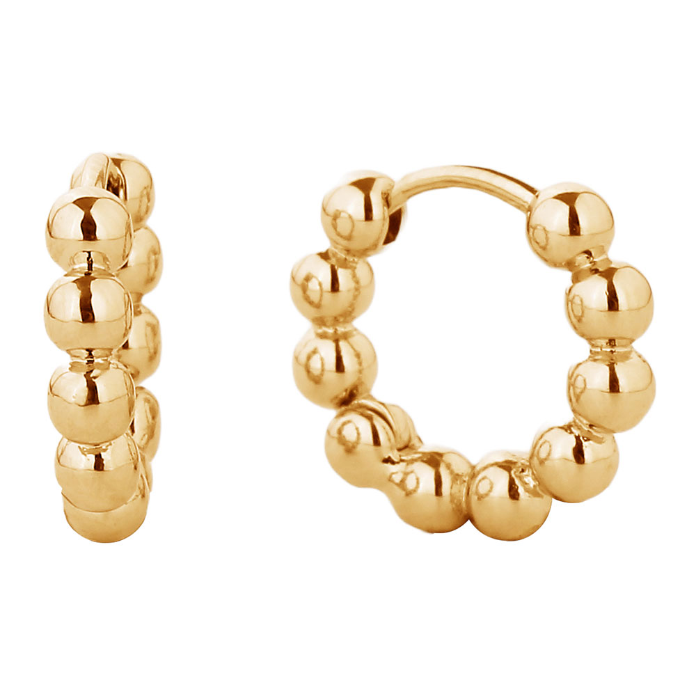 Details • Size : 0.6" X 0.6" • Huggie Back • Elegant beaded hoop earrings designed with polished round beads in a timeless circular style. Lightweight and versatile, these hoops enhance any outfit with subtle shine and modern elegance, making them perfect for daily wear or dressing up for special occasions. • Brass • Gold Dipped • Hypoallergenic • Lead and Nickel Compliant • Made In Korea