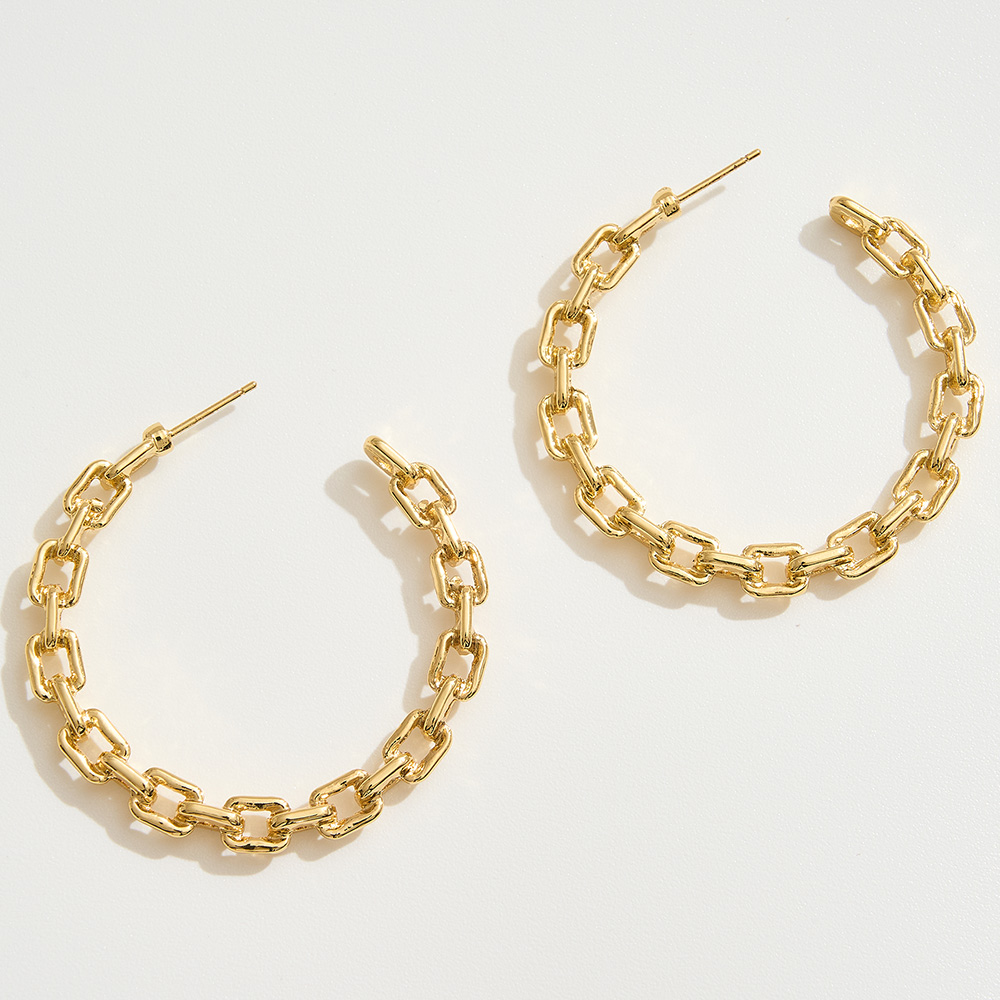 Details • Size : 1.75" X 1.75" • Post Back • Make a statement with these chain-link hoop earrings, designed with interlocking links that bring a modern edge to a classic silhouette. Their bold structure offers both strength and elegance, making them a versatile piece for everyday styling or standout looks. • Brass • Gold Dipped • Hypoallergenic • Lead and Nickel Compliant • Made In Korea