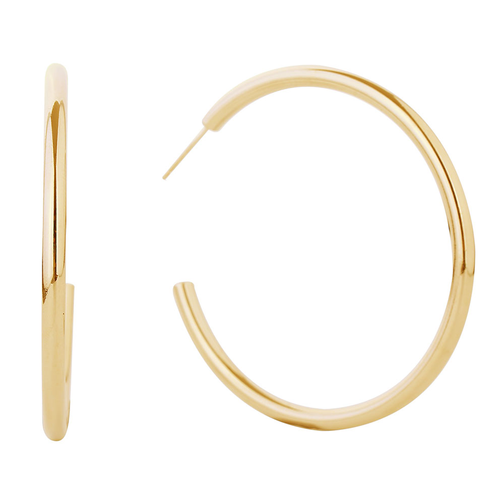 Details • Size : 2" X 2" • Post Back • Water resistant plating • Elegant small hoop earrings with a sleek minimalist design, ideal for everyday wear or layering with other jewelry. Lightweight and versatile, these hoops add a refined touch to casual and formal outfits alike. • Brass • Gold Dipped • Hypoallergenic • Lead and Nickel Compliant • Made In Korea