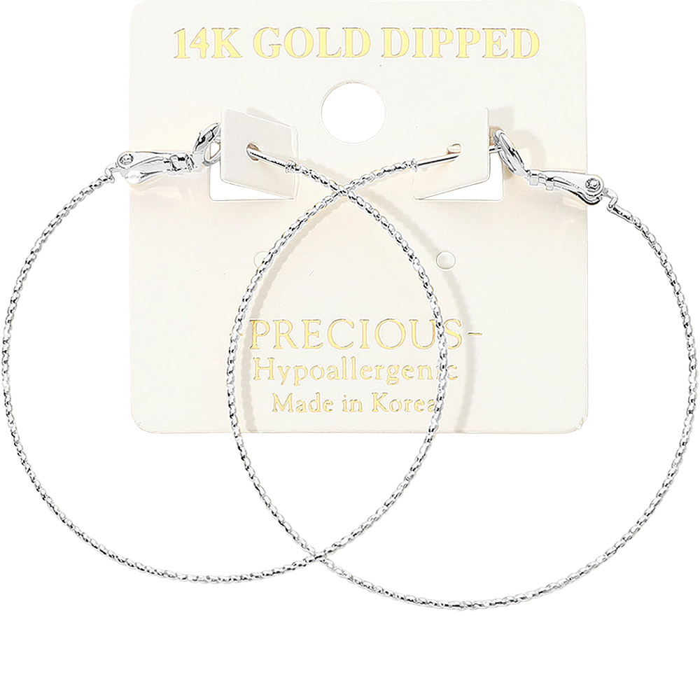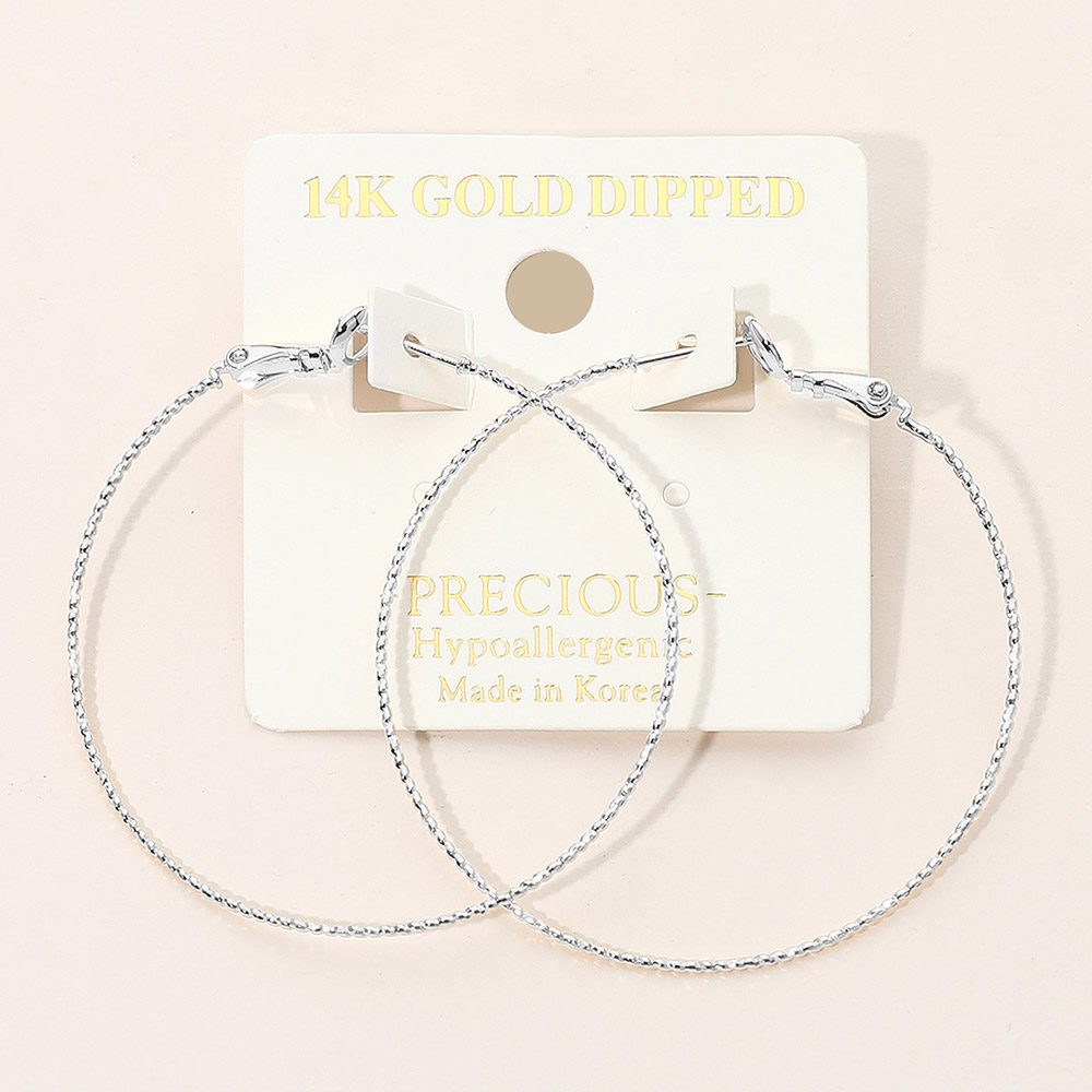 Details • Size : 2" X 2" • Omega Back • Lightweight hoop earrings featuring a thin, textured surface for a stylish statement. Designed for comfort and elegance, these hoops are perfect for daily wear or special events. An easy match for casual and dressy looks alike. • Hypoallergenic • Made In Korea • Gold Dipped