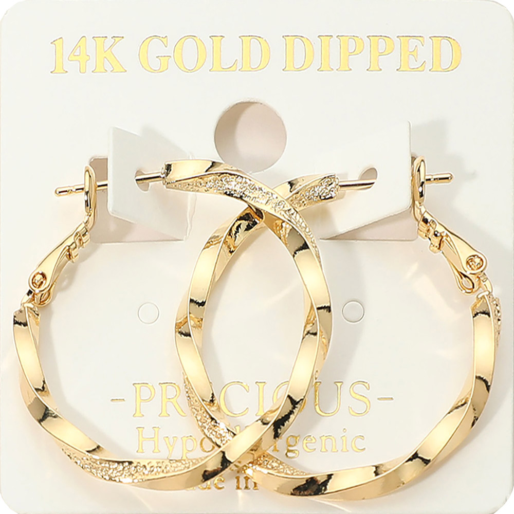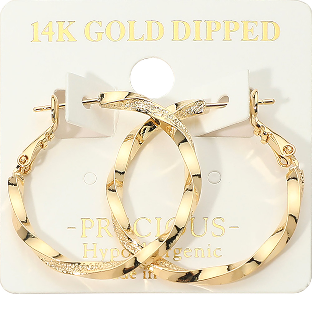 Details • Size : 1.25" X 1.25" • Omega Back • These textured twisted hoop earrings feature an elegant layered design that adds depth and shine to any look. Crafted with a secure latch closure for comfortable all-day wear, they blend modern style with timeless appeal, making them perfect for everyday outfits or special occasions. • Gold Dipped • Hypoallergenic • Made In Korea