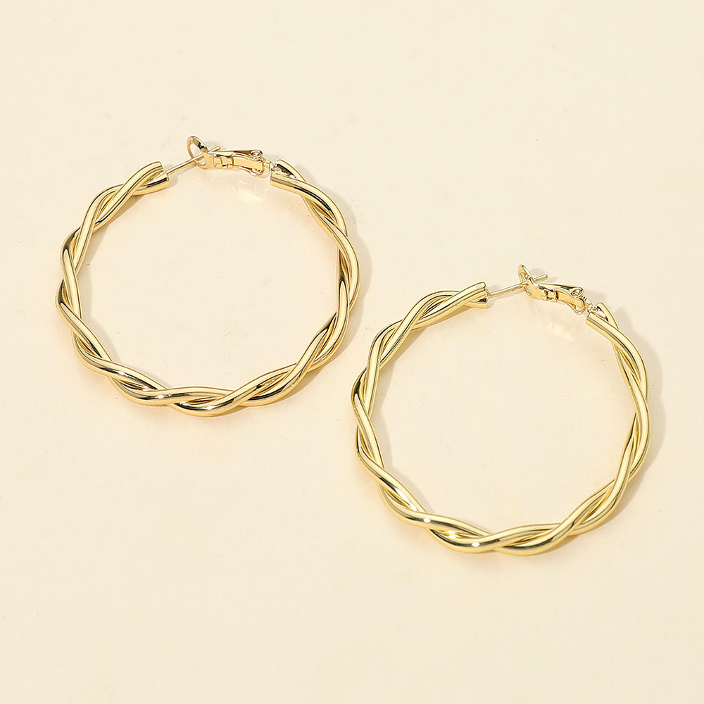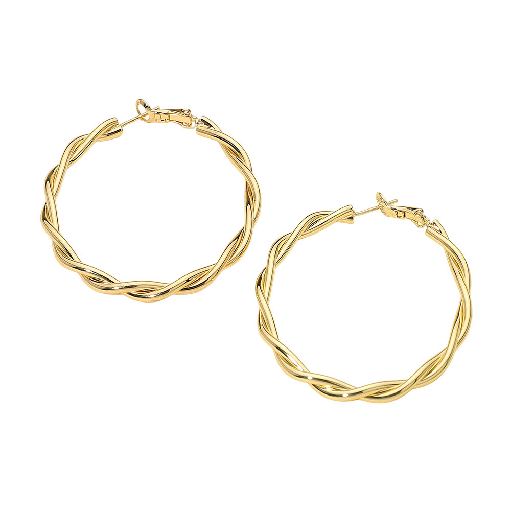 Details • Size : 2" X 2" • Omega Back • Stylish hoop earrings featuring a twisted braided design that adds texture and elegance to any look. Lightweight and versatile, these earrings are perfect for casual or dressy occasions, offering a timeless accessory that enhances everyday outfits with a chic and modern touch. • Brass • Gold Dipped • Hypoallergenic • Lead and Nickel Compliant • Made In Korea