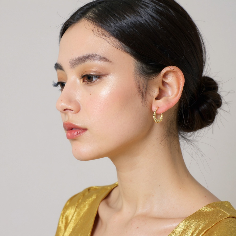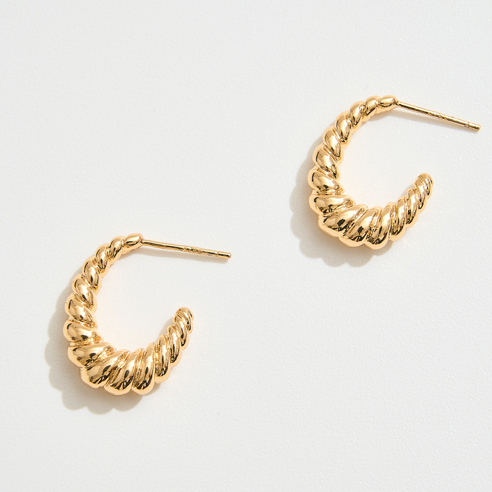 Details • Size : 0.7" X 0.75" • Post Back • Elevate your style with these twisted ribbed hoop earrings, featuring a bold sculptural design that adds depth and texture. Their sleek, polished finish makes them the perfect blend of modern elegance and timeless charm, ideal for day-to-night wear. • Brass • Gold Dipped • Hypoallergenic • Lead and Nickel Compliant • Made In Korea