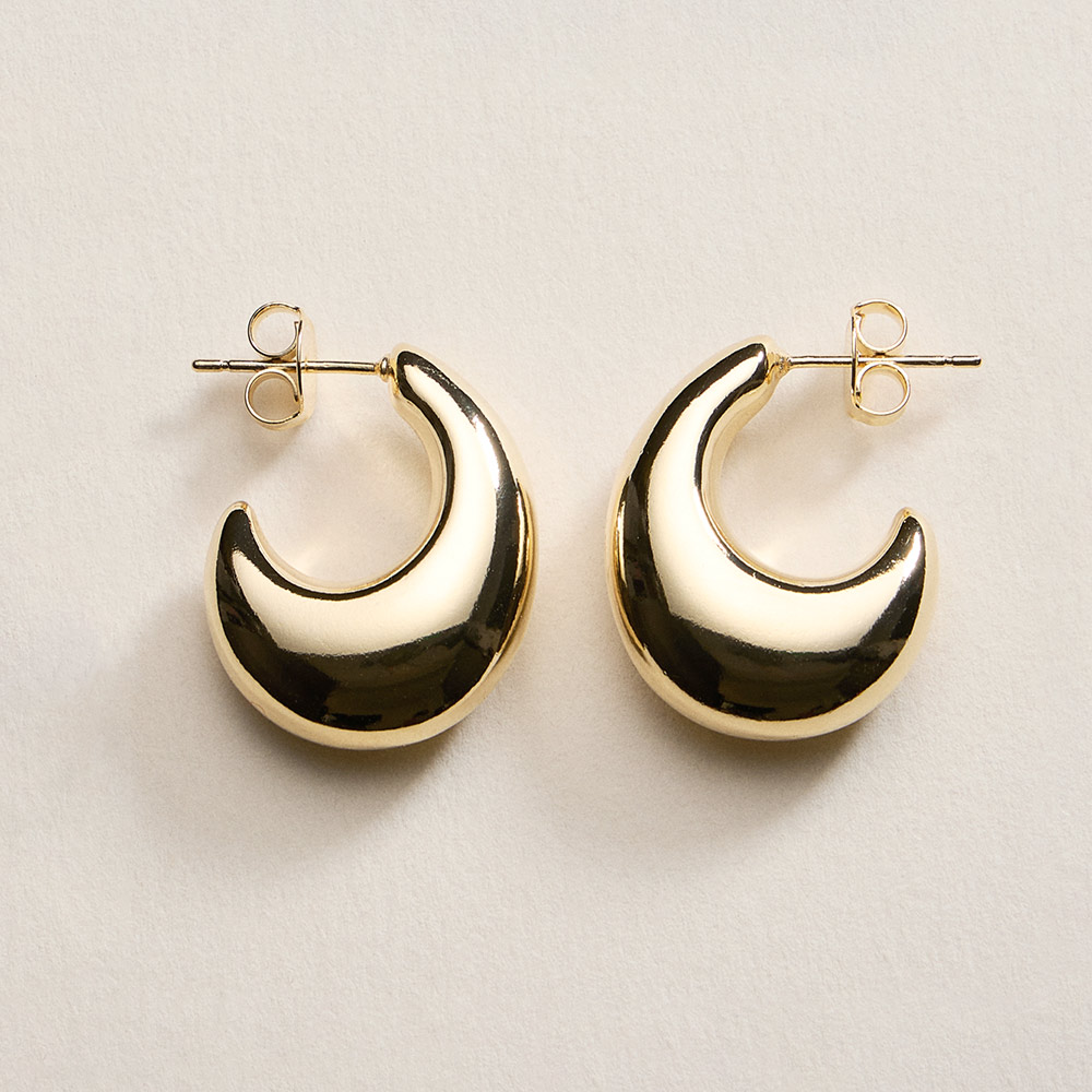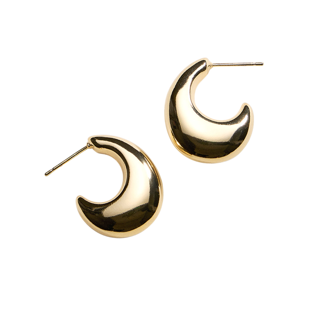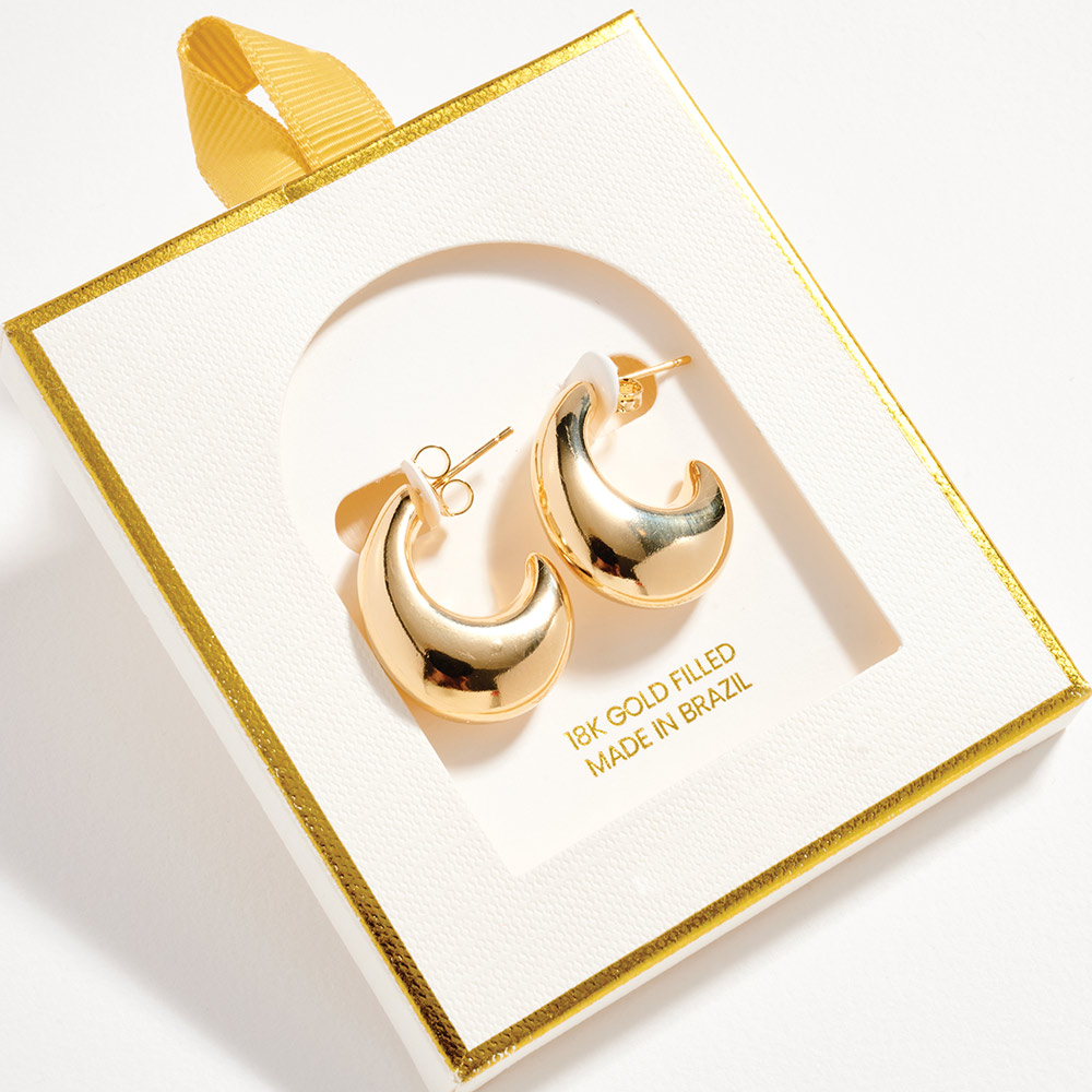 Details • Size : 0.75" X 1" X 0.3" • Post Back • Bold crescent-shaped hoop stud earrings designed to add modern volume and polished appeal. The smooth curved silhouette creates a statement look while remaining comfortable for daily wear, work outfits, and evening styling. A versatile accessory ideal for trend-focused collections and gifting. • Gold Filled • Hypoallergenic • Lead and Nickel Compliant • Made In Brazil