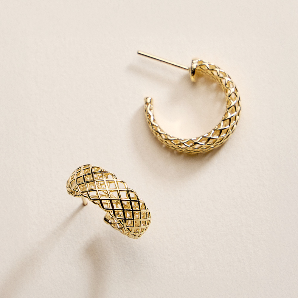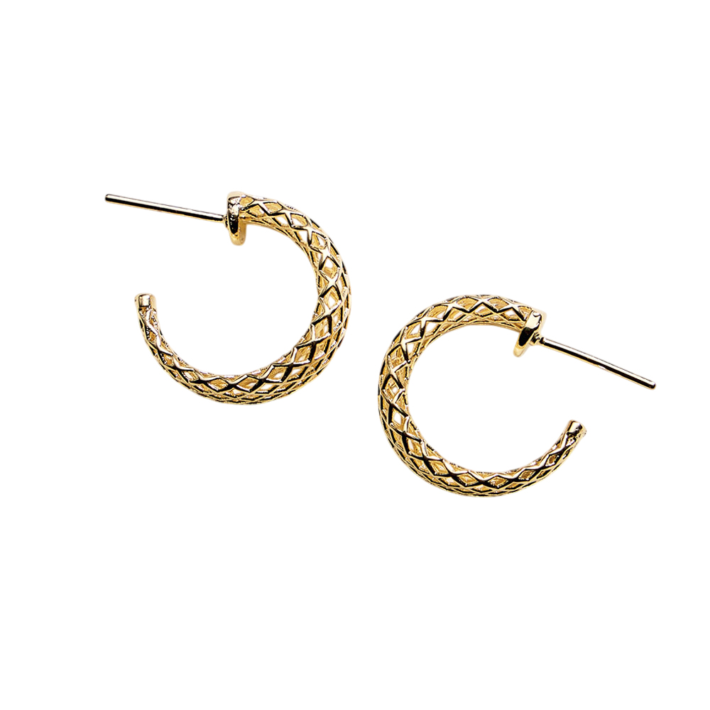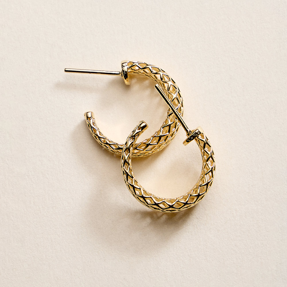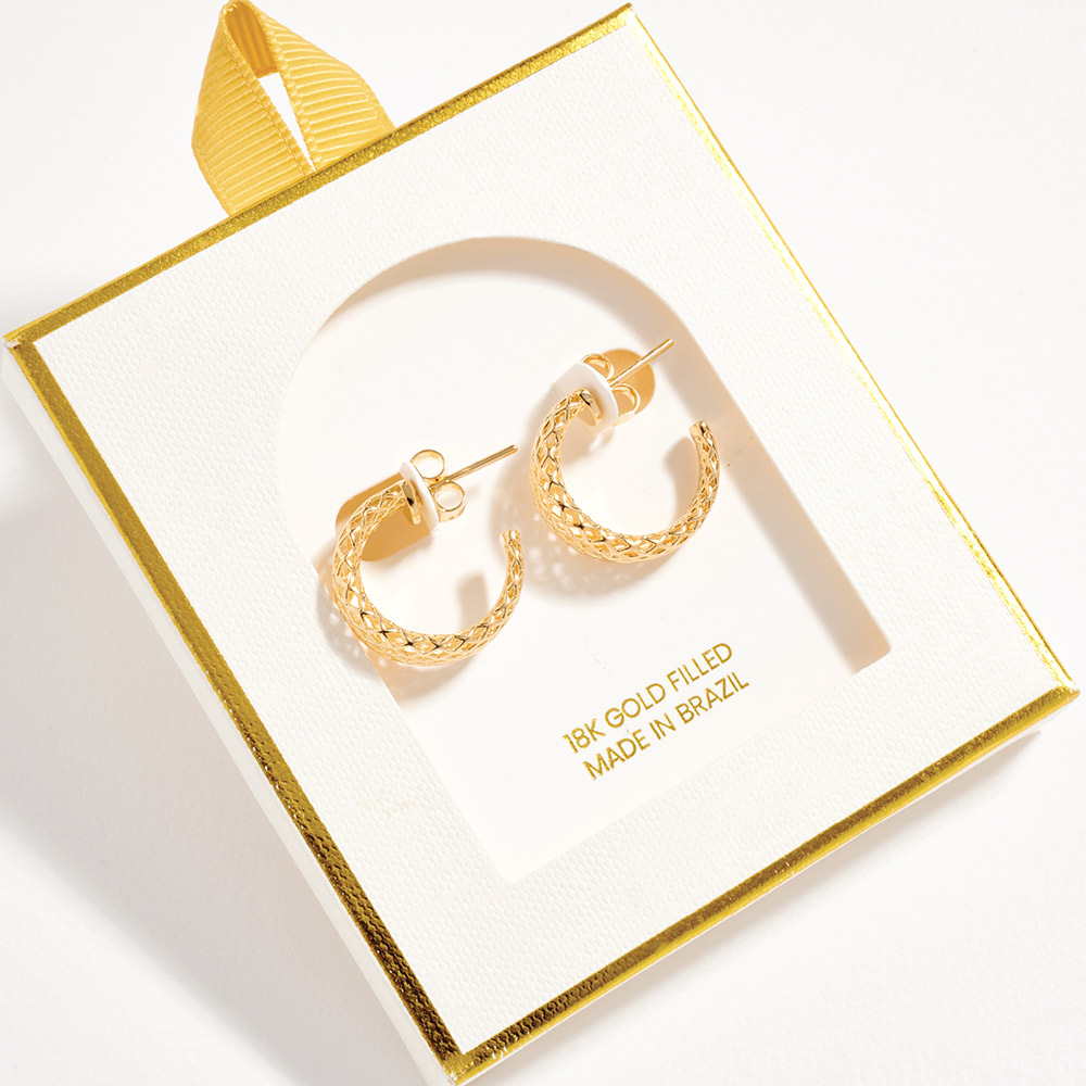 Details • Size : 0.75" X 0.75" X 0.25" • Post Back • Textured small curved hoop earrings designed with an intricate patterned surface that adds depth and visual interest. The compact size makes them ideal for everyday wear while still offering a polished statement. Easy to pair with casual or elevated looks, these hoops are perfect for layering, gifting, and versatile jewelry collections. • Gold Filled • Hypoallergenic • Lead and Nickel Compliant • Made In Brazil