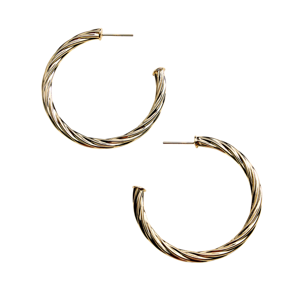Details • Size : 1.75" X 1.75" X 0.2" • Post Back • Classic hoop earrings with a twisted silhouette that adds subtle texture and dimension. Designed for comfortable daily wear, these hoops offer a timeless look that pairs easily with casual outfits, office styling, or layered jewelry for a polished, versatile finish. • Gold Filled • Hypoallergenic • Lead and Nickel Compliant • Made In Brazil