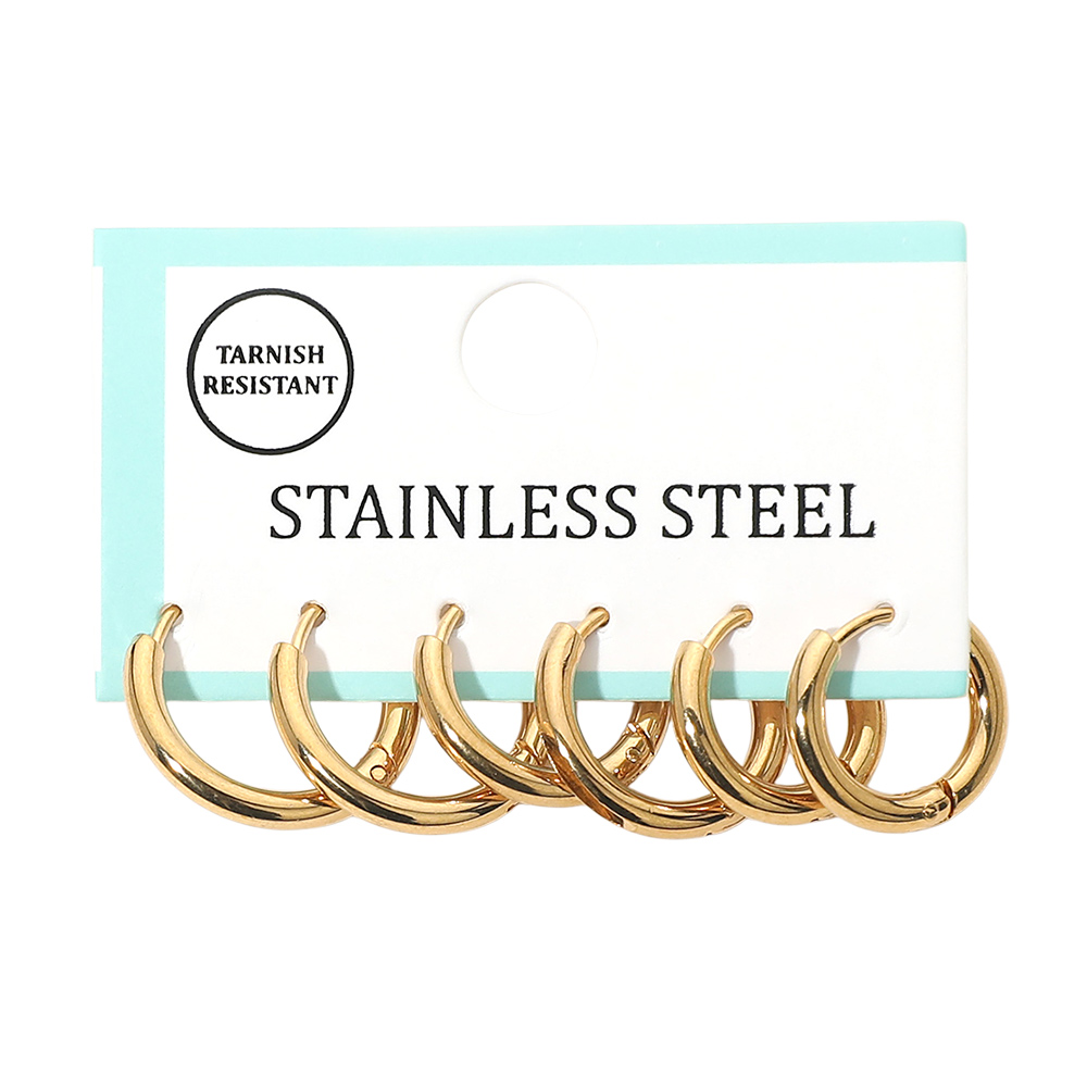 Details • Size : 0.6" - 0.7" L • Huggie Back • Timeless hoop earring multi pair set designed for everyday styling and layering. Featuring smooth rounded silhouettes in graduated sizes, this versatile set allows easy mixing and matching across multiple piercings, perfect for minimalist looks or stacked statement ear styling. • Lead and Nickel Compliant • Stainless Steel
