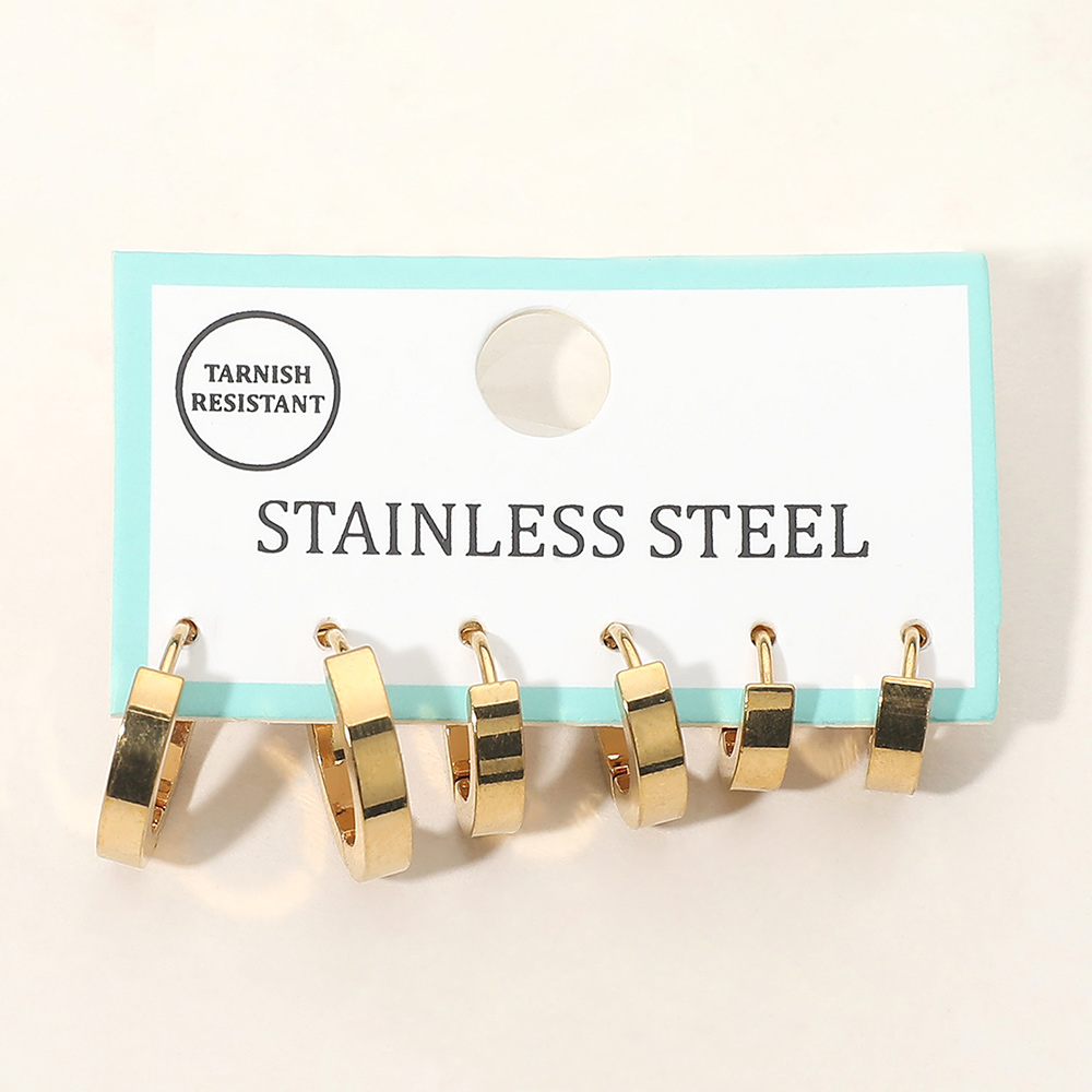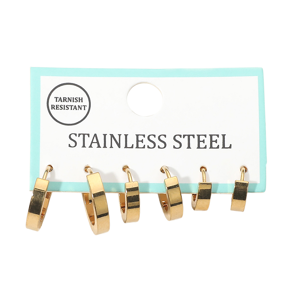 Details • Size : 0.4" - 0.6" L • Huggie Back • Modern three-pair flat hoop earring set designed for clean, minimalist styling. Featuring sleek, smooth profiles in graduated sizes, this versatile trio is ideal for everyday wear, stacking across multiple piercings, or effortless outfit coordination. A timeless essential for any jewelry collection. • Lead and Nickel Compliant • Stainless Steel