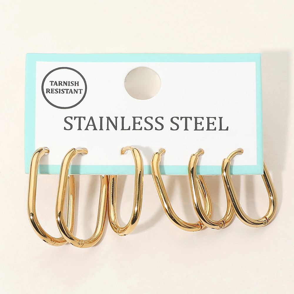 Details • Size : 0.75" - 1" L • Huggie Back • Classic three-pair oval hoop earring set designed for versatile, everyday styling. Featuring smooth, elongated silhouettes in graduated sizes, this timeless set is perfect for mixing and matching across multiple piercings. An effortless choice for daily wear, layering, or gifting. • Lead and Nickel Compliant • Stainless Steel