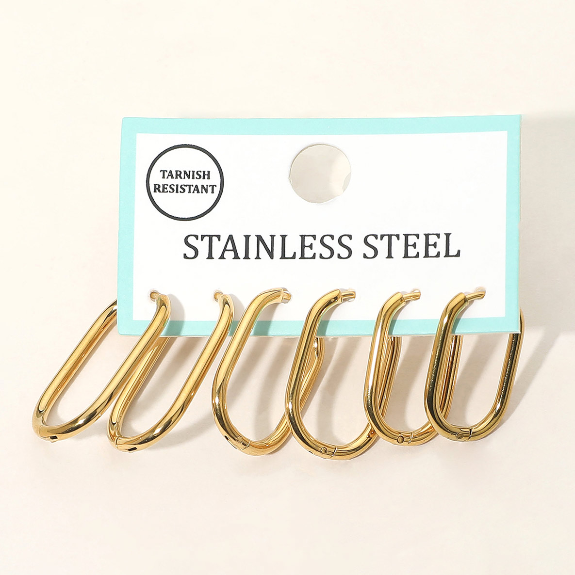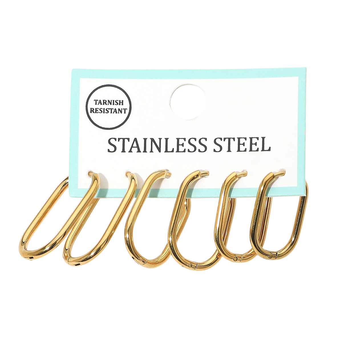 Details • Size : 0.75" - 0.9" L • Huggie Back • Versatile three-pair oval hoop earring set designed for effortless styling. Featuring smooth, modern silhouettes in graduated sizes, this timeless set is perfect for mixing, matching, or layering. Ideal for everyday wear, gifting, and creating polished looks with ease. • Lead and Nickel Compliant • Stainless Steel