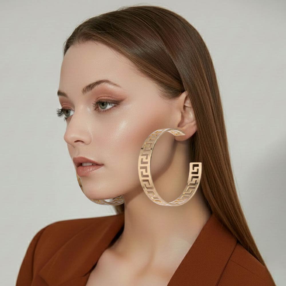 Details • Size : 2.6" X 2.6" X 0.6" • Post Back • These geometric cutout hoop earrings feature a bold openwork metal design with clean lines and a structured silhouette. Designed to make a statement while remaining versatile, they pair effortlessly with casual looks, office outfits, or evening styling for a modern, confident finish. • Lead and Nickel Compliant