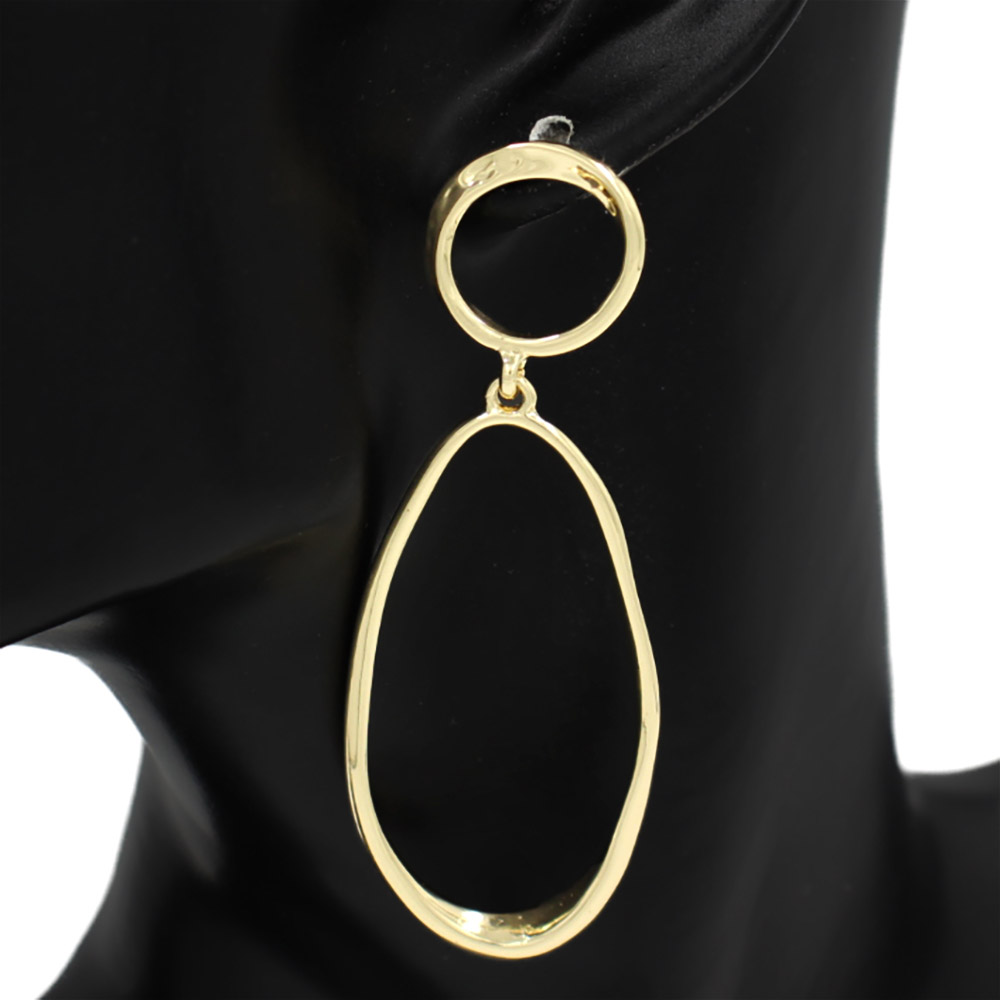 Details • Size : 1.2" X 3" • Post Back • These sculptural drop hoop earrings feature a fluid, elongated silhouette that creates a bold yet refined statement. Their minimalist open-frame design adds modern elegance, making them a striking accessory for enhancing both everyday outfits and sophisticated looks. • Lead and Nickel Compliant