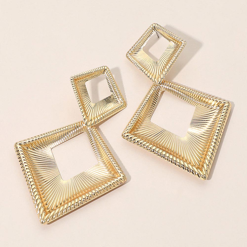 Details • Size : 2" X 3.25" • Post Back • Bold geometric drop earrings featuring a layered open square design with fine linear texture that adds depth and dimension. These statement earrings offer lightweight movement with a modern, sculptural look, making them perfect for everyday styling, work outfits, or elevated evening wear. Ideal for customers seeking contemporary square drop earrings with artistic detail. • Lead and Nickel Compliant