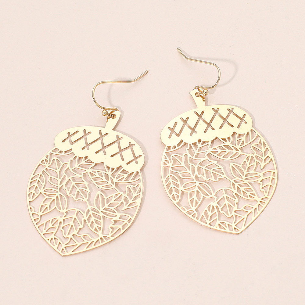 Details • Size : 1.4" X 2.4" • Fish Hook Back • Add a touch of woodland charm with these leafy acorn cutout drop earrings. Designed with intricate leaf patterns and a delicate acorn silhouette, they bring nature-inspired elegance to any outfit. Perfect for casual wear or dressing up with a whimsical and stylish flair. • Brass • Lead and Nickel Compliant