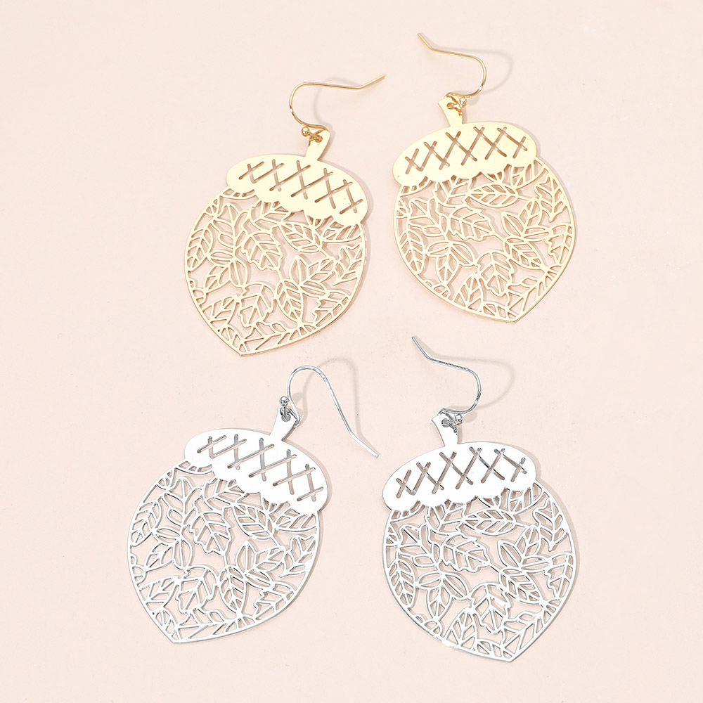 Details • Size : 1.4" X 2.4" • Fish Hook Back • Add a touch of woodland charm with these leafy acorn cutout drop earrings. Designed with intricate leaf patterns and a delicate acorn silhouette, they bring nature-inspired elegance to any outfit. Perfect for casual wear or dressing up with a whimsical and stylish flair. • Brass • Lead and Nickel Compliant