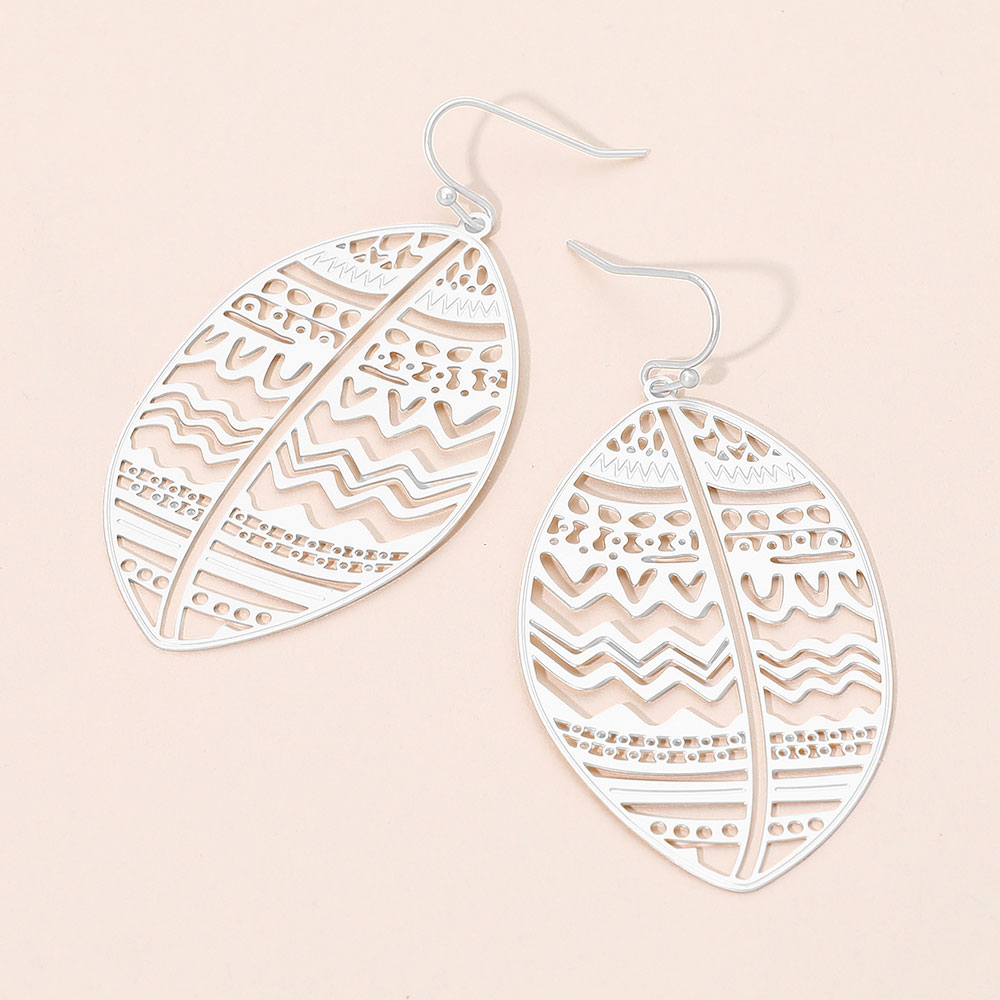 Brass Metal Tribal Pattern Cutout leaf Dangle Earrings