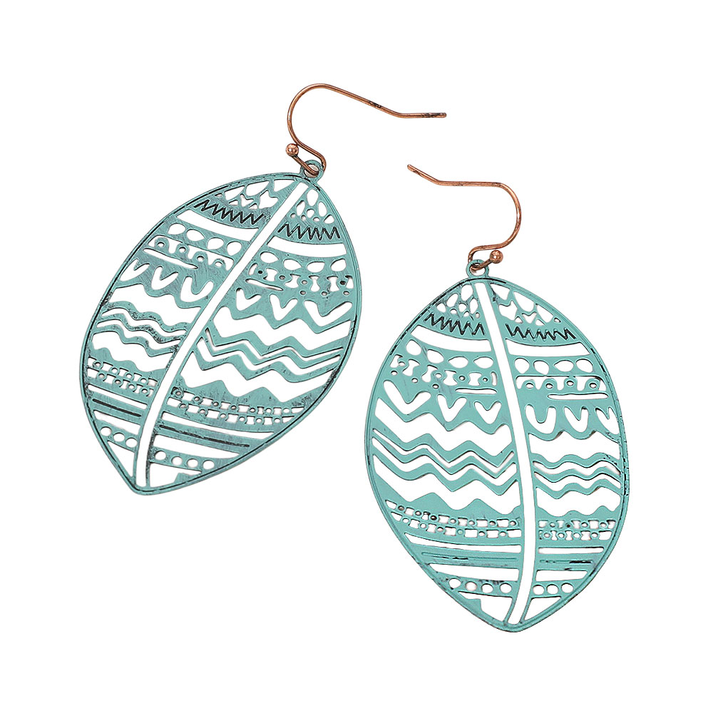 Brass Metal Tribal Pattern Cutout leaf Dangle Earrings