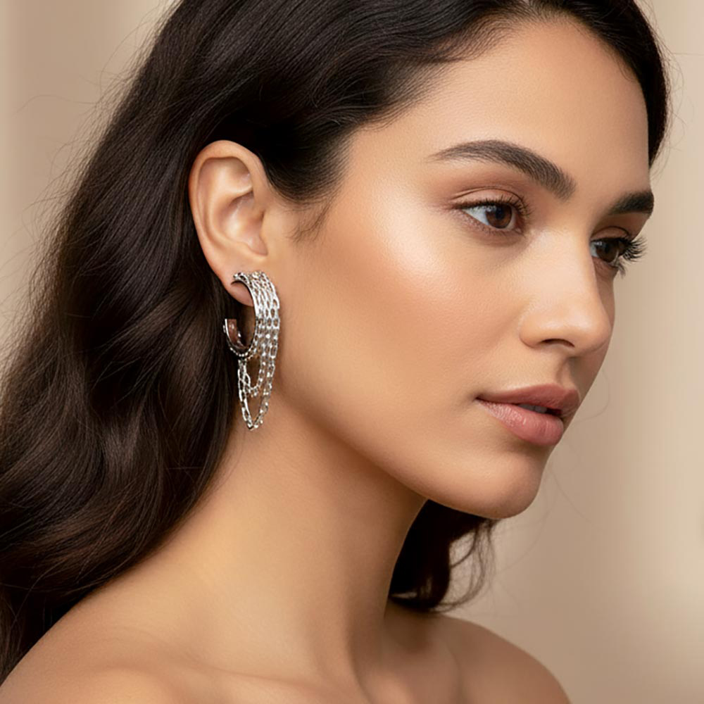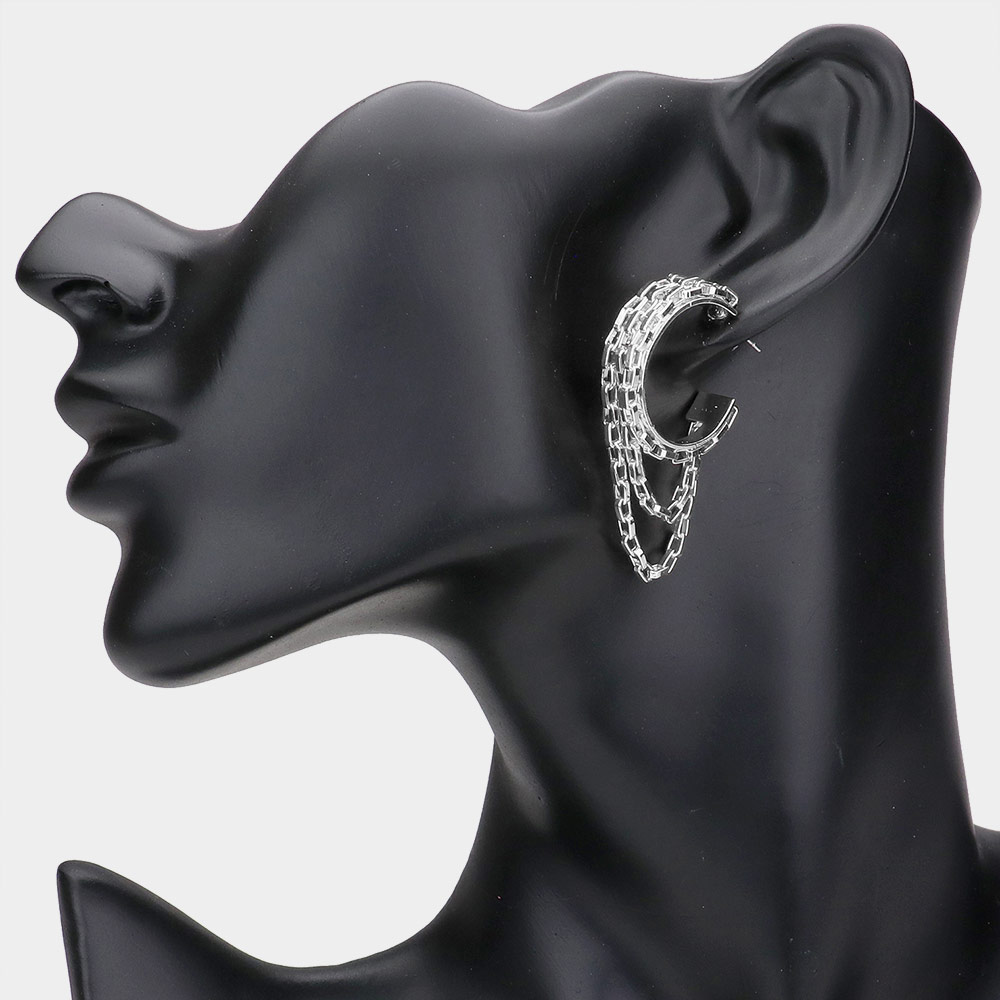 Details • Size : 1.1" X 1.75" • Post Back • Add an edgy twist to your jewelry collection with this double hoop earring featuring layered chain drop accents. Perfect for modern streetwear, night-out looks, or everyday statement style, this bold accessory combines hoop elegance with chain details for a striking and versatile fashion piece. • Lead and Nickel Compliant