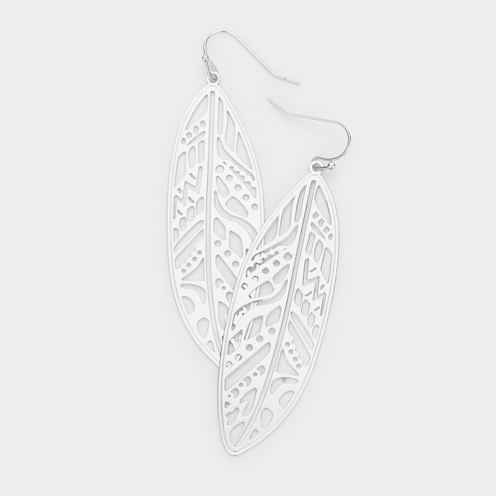 Filigree Flower Leaf Detailed Brass Metal Marquise Dangle Earrings