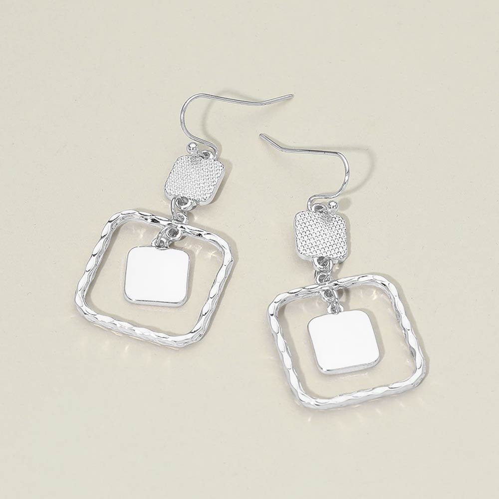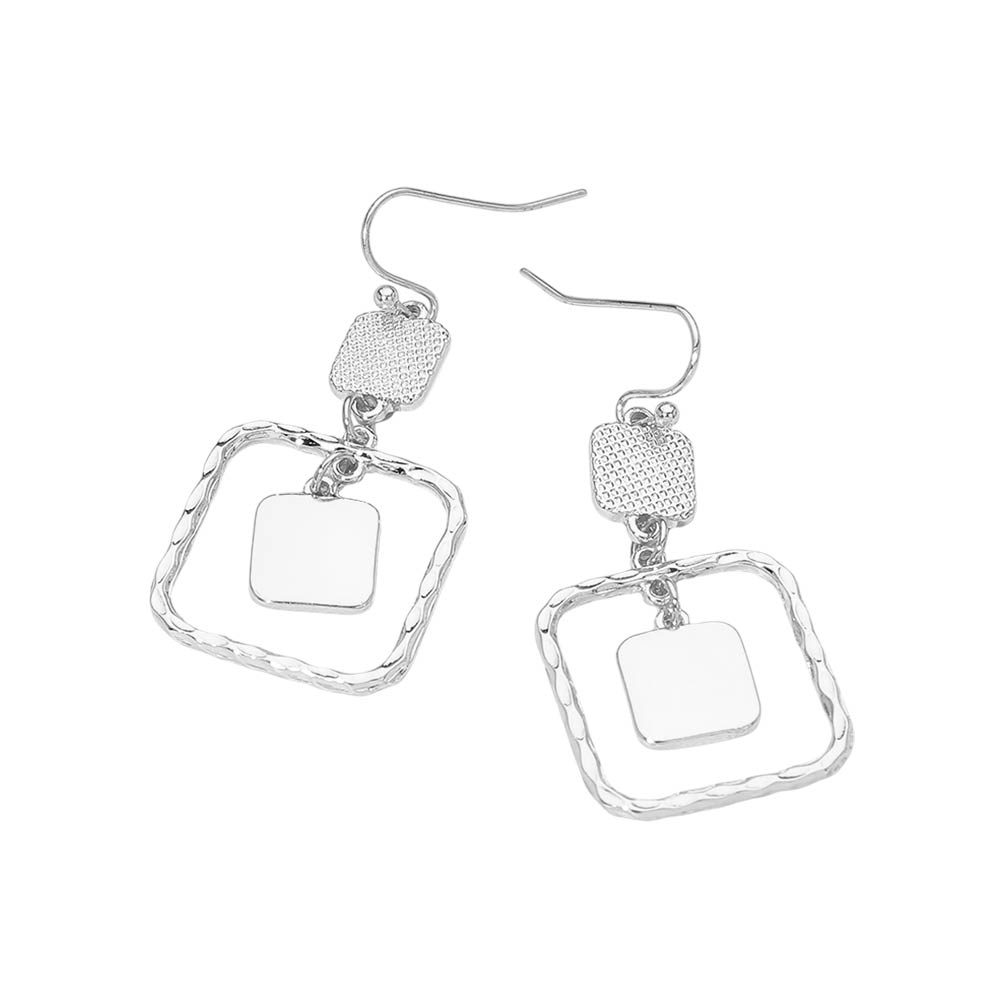 Details • Size : 0.8" X 1.75" • Fish Hook Back • Elevate everyday style with these geometric square layered drop hook earrings. Featuring a modern open frame design with suspended inner accents, they create elegant movement and visual depth. Lightweight and versatile, they pair effortlessly with casual outfits, workwear, or evening looks, making them a stylish addition to any jewelry collection. • Lead and Nickel Compliant