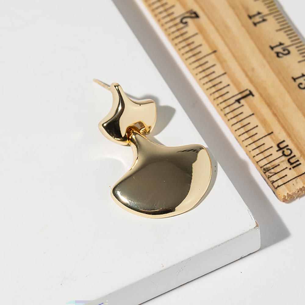 Details • Size : 0.9" X 1.4" • Modern abstract fan shape drop stud earrings featuring a smooth sculptural silhouette with a subtle dangle design. A stylish choice for everyday wear or elevated looks, ideal for boutiques seeking contemporary, minimalist jewelry with versatile appeal and trend-forward elegance. • Gold Dipped • Lead and Nickel Compliant • Made In Korea • Sterling Silver Post