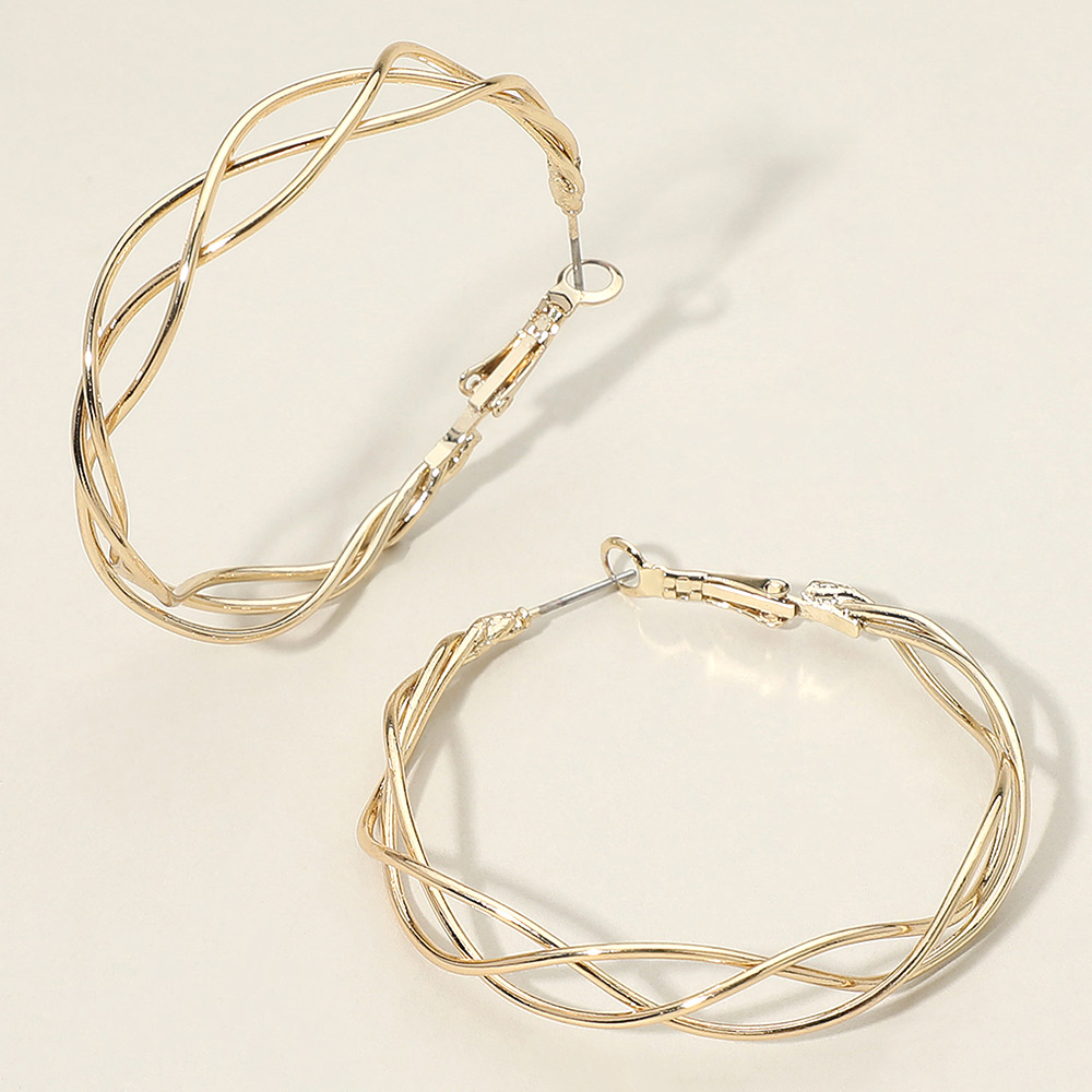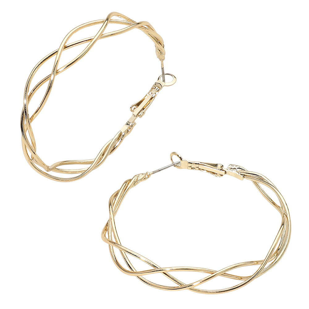 Details • Size : 2" X 2" X 0.4" • Omega Back • Stylish hoop earrings featuring an elegant twisted wire crossover design for a dimensional, modern look. Lightweight and versatile, they add polished sophistication to everyday outfits or elevate evening ensembles with their airy sculptural style. • Lead and Nickel Compliant • Gold Dipped