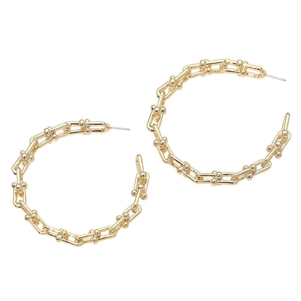 Details • Size : 3" X 2.75" • Post Back • Elevate your jewelry collection with textured chain hoop earrings designed with bold linked detailing. Their unique structure adds a modern edge to everyday style, making them a standout accessory for both casual and dressy looks. Lightweight and eye-catching, they create effortless statement appeal. • Lead and Nickel Compliant • Gold Dipped