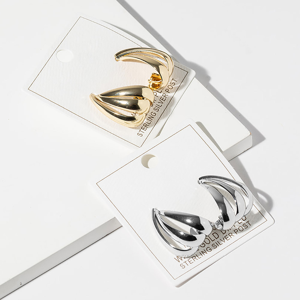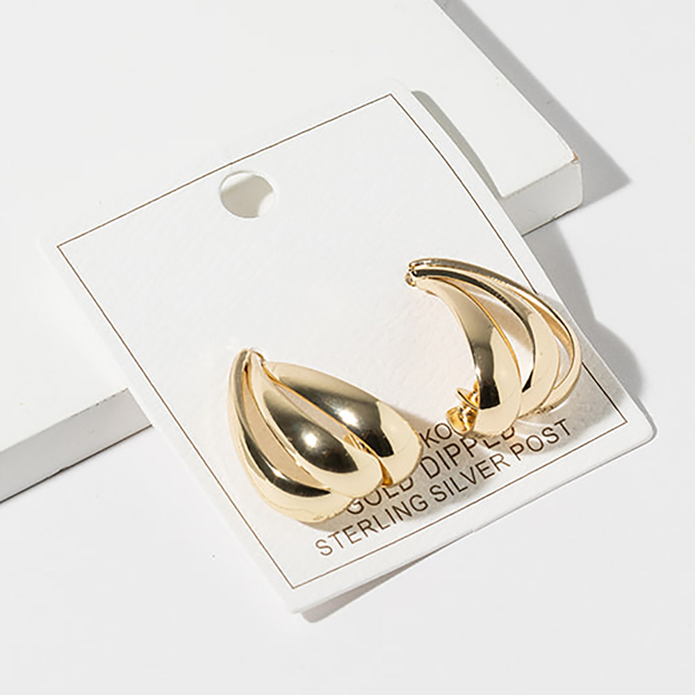 Details • Size : 0.75" X 1.1" • Modern stud earrings featuring a sculpted teardrop silhouette with layered curved detailing and a smooth polished finish. Designed to elevate everyday looks and refined outfits, these statement studs offer dimensional style, elegant contours, and versatile appeal, making them a standout addition to any contemporary jewelry collection. • Gold Dipped • Lead and Nickel Compliant • Made In Korea • Sterling Silver Post
