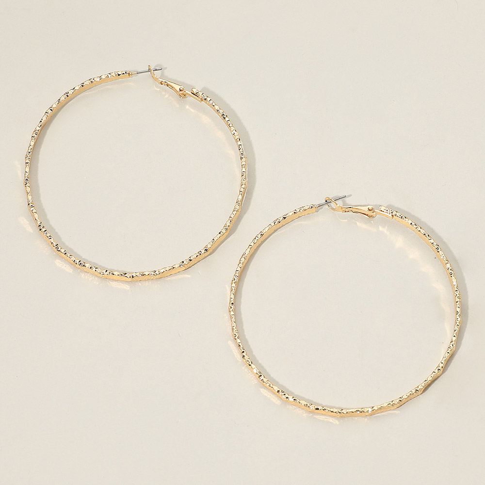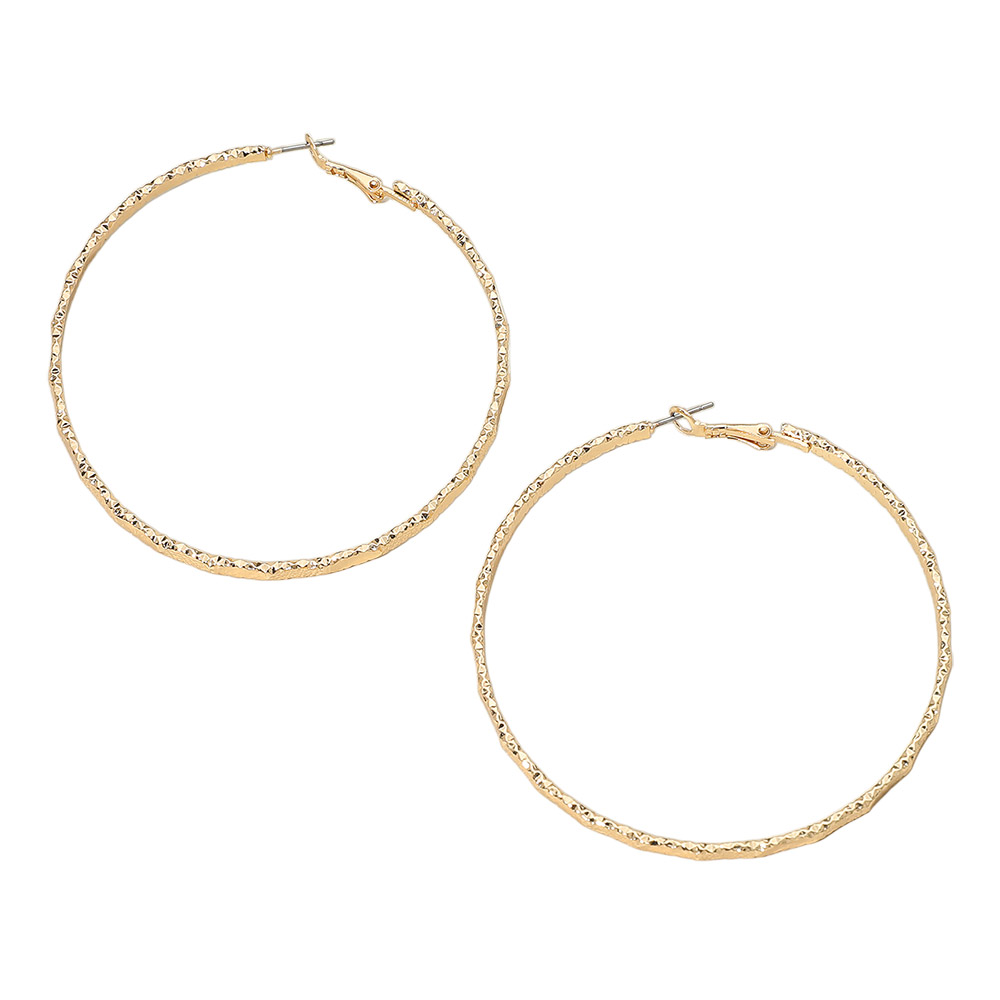 Details • Size : 2.75" X 2.75" • Omega Back • Elegant large textured hoop earrings featuring a subtle hammered-style finish for added shine and dimension. Lightweight and easy to wear with a secure latch-back closure, perfect for elevating everyday outfits or adding a stylish touch to dressy looks. • Lead and Nickel Compliant • Gold Dipped