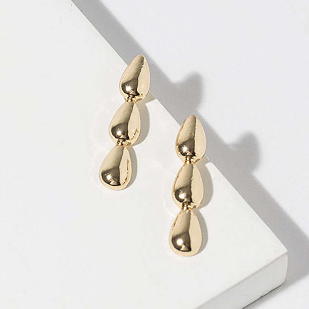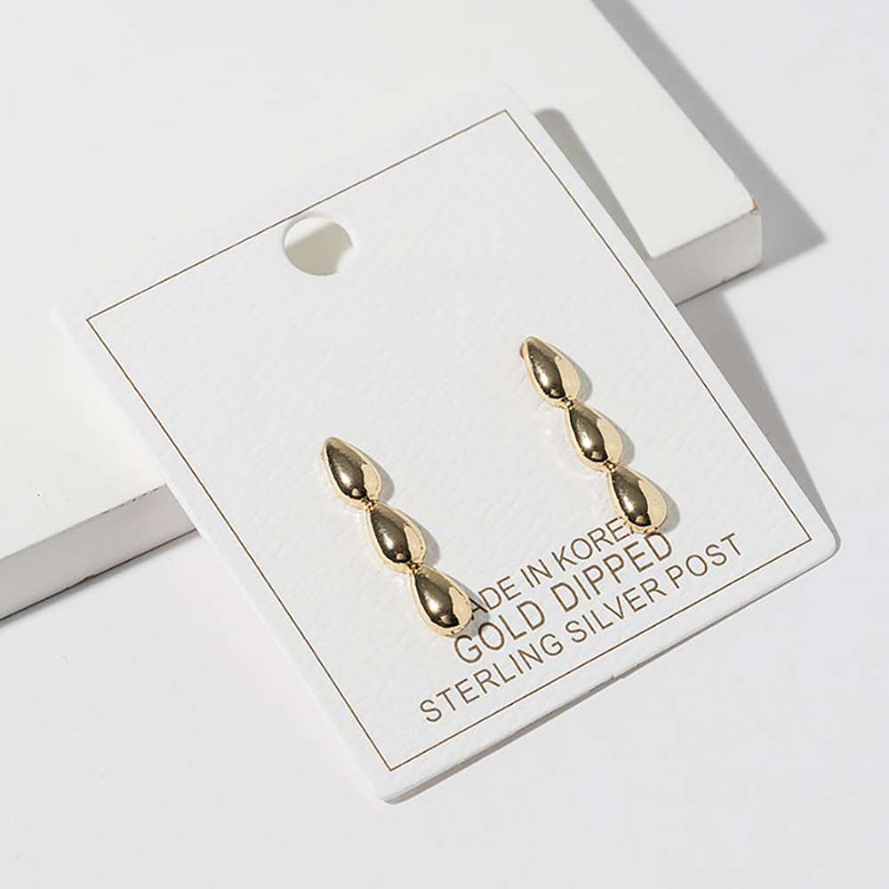 Details • Size : 0.2" X 0.9" • Elegant stud earrings featuring a sleek triple drop design with softly rounded shapes arranged in a vertical silhouette. Designed to add subtle movement and refined style, these studs are perfect for everyday wear, work outfits, and dressy occasions, offering modern simplicity and timeless appeal for any jewelry collection. • Gold Dipped • Lead and Nickel Compliant • Made In Korea • Sterling Silver Post