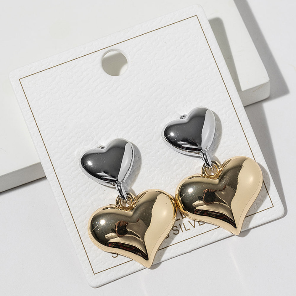 Details • Size : 0.8" X 1.3" • Double heart drop earrings designed with a sleek layered silhouette that adds dimension and shine. This romantic yet modern style offers effortless movement and visual impact, making it ideal for everyday wear, giftable assortments, and seasonal collections across boutiques and online stores. • Gold Dipped • Lead and Nickel Compliant • Made In Korea • Sterling Silver Post