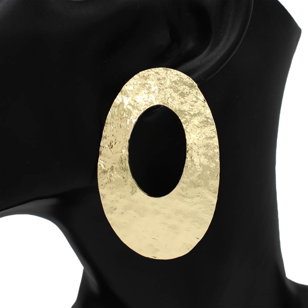 Details • Size : 1.6" X 2.5" • Post Back • Bold oval cutout statement earring featuring a textured surface that creates eye-catching dimension and modern appeal. Designed to elevate everyday looks or complement evening styling, this lightweight silhouette offers standout impact for trend-focused accessory collections. • Lead and Nickel Compliant