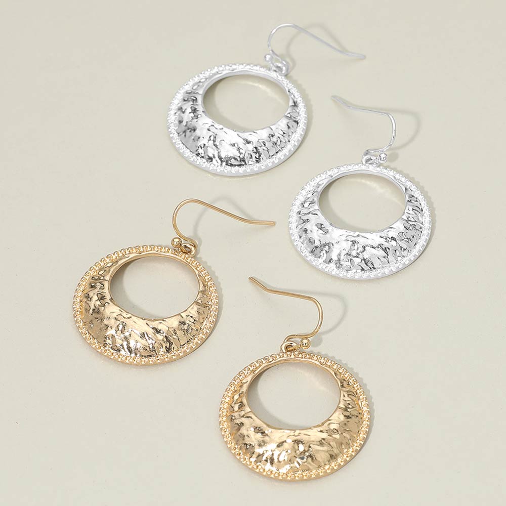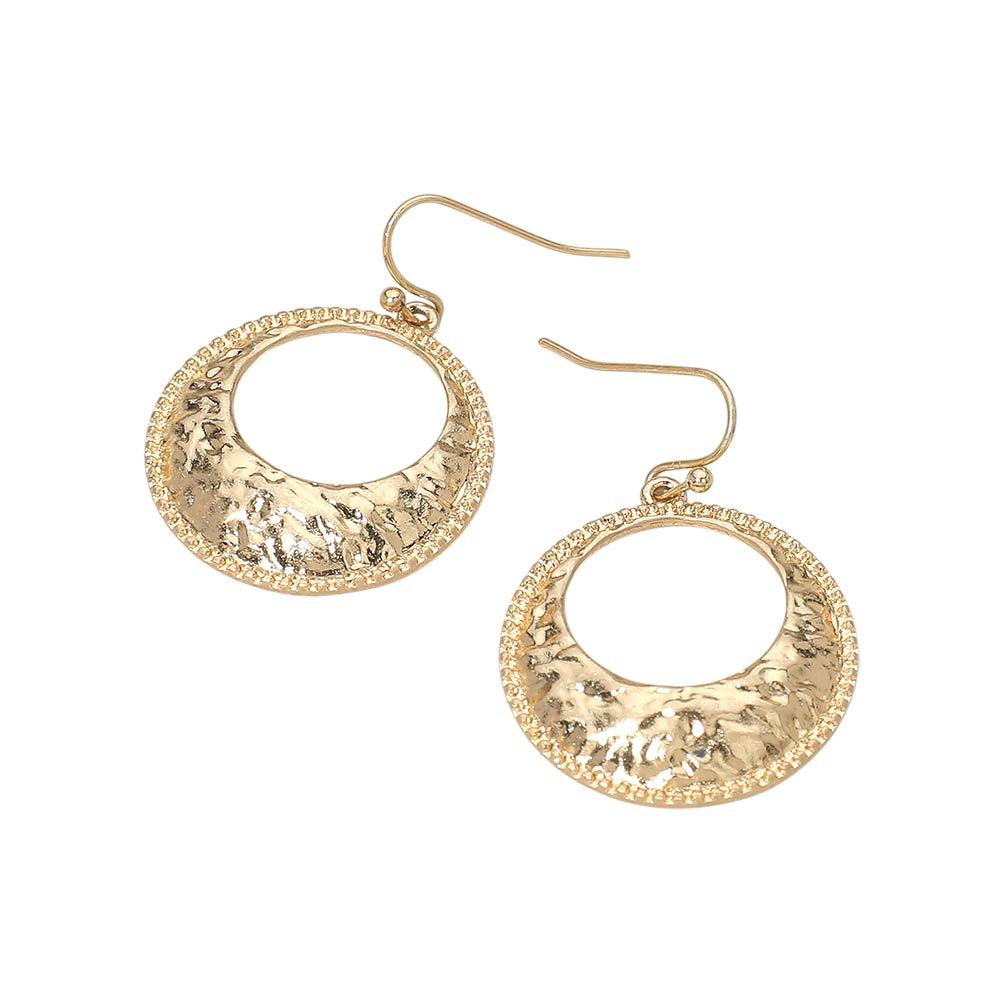 Details • Size : 1.1" X 1.5" • Fish Hook Back • Add modern elegance to any look with these textured open circle drop hook earrings. Designed with a sculpted surface and open center, they offer eye catching dimension and graceful movement. Lightweight and easy to wear, they transition seamlessly from everyday outfits to evening styling, making them a versatile choice for boutiques and trend focused collections. • Lead and Nickel Compliant