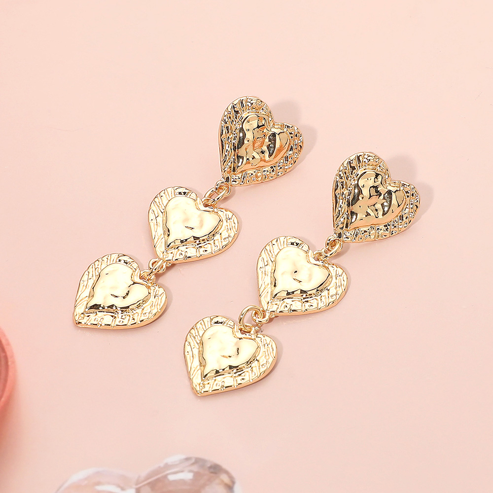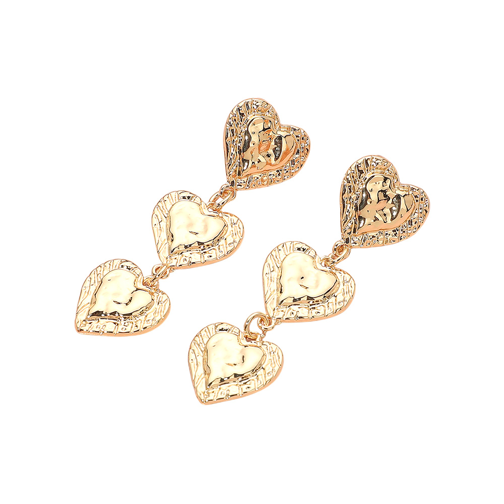 Details • Size : 0.7" X 2.25" • Post Back • Chic triple heart drop earrings featuring textured detailing and layered design. Lightweight yet bold, these earrings bring romantic charm and statement style to both casual and dressy outfits. • Lead and Nickel Compliant