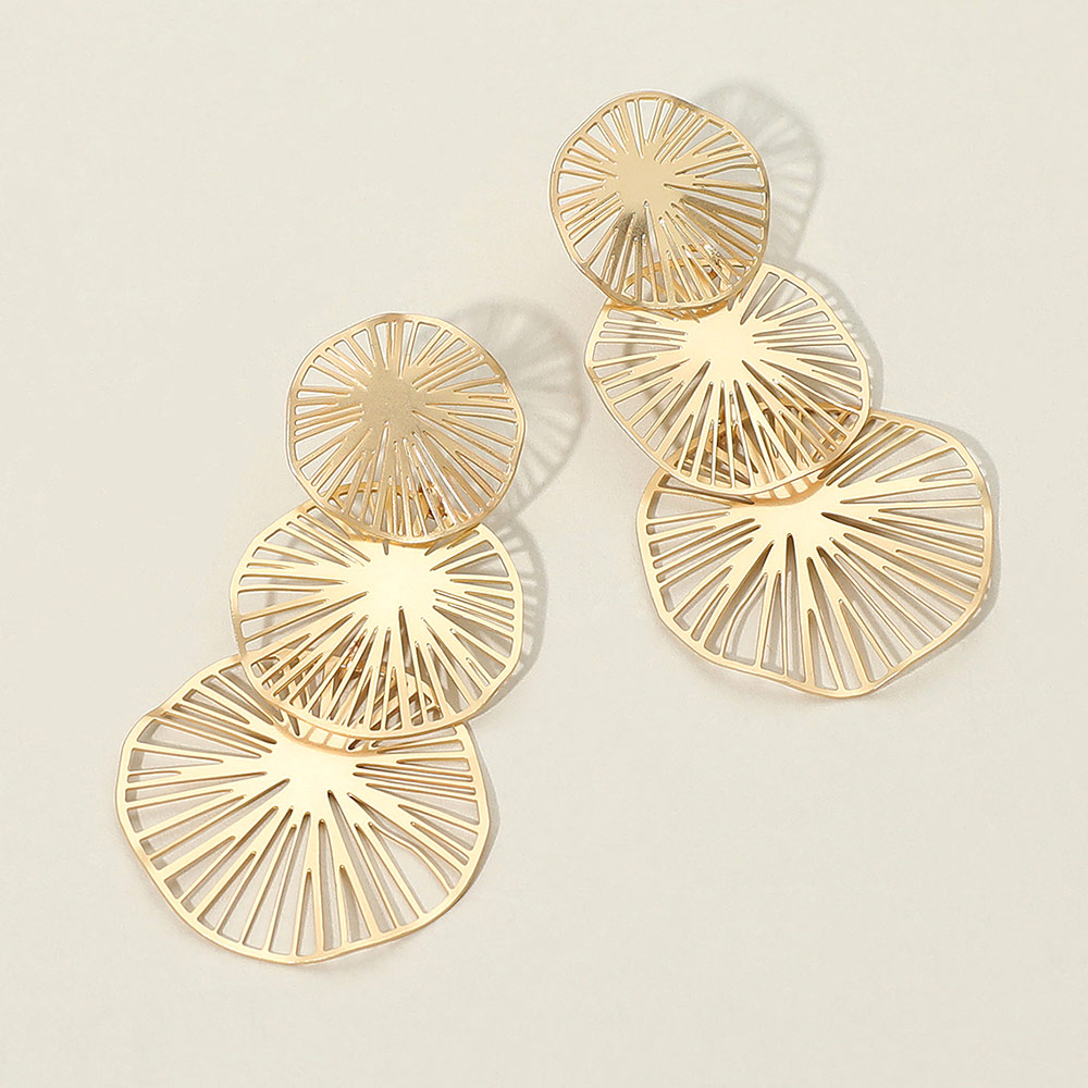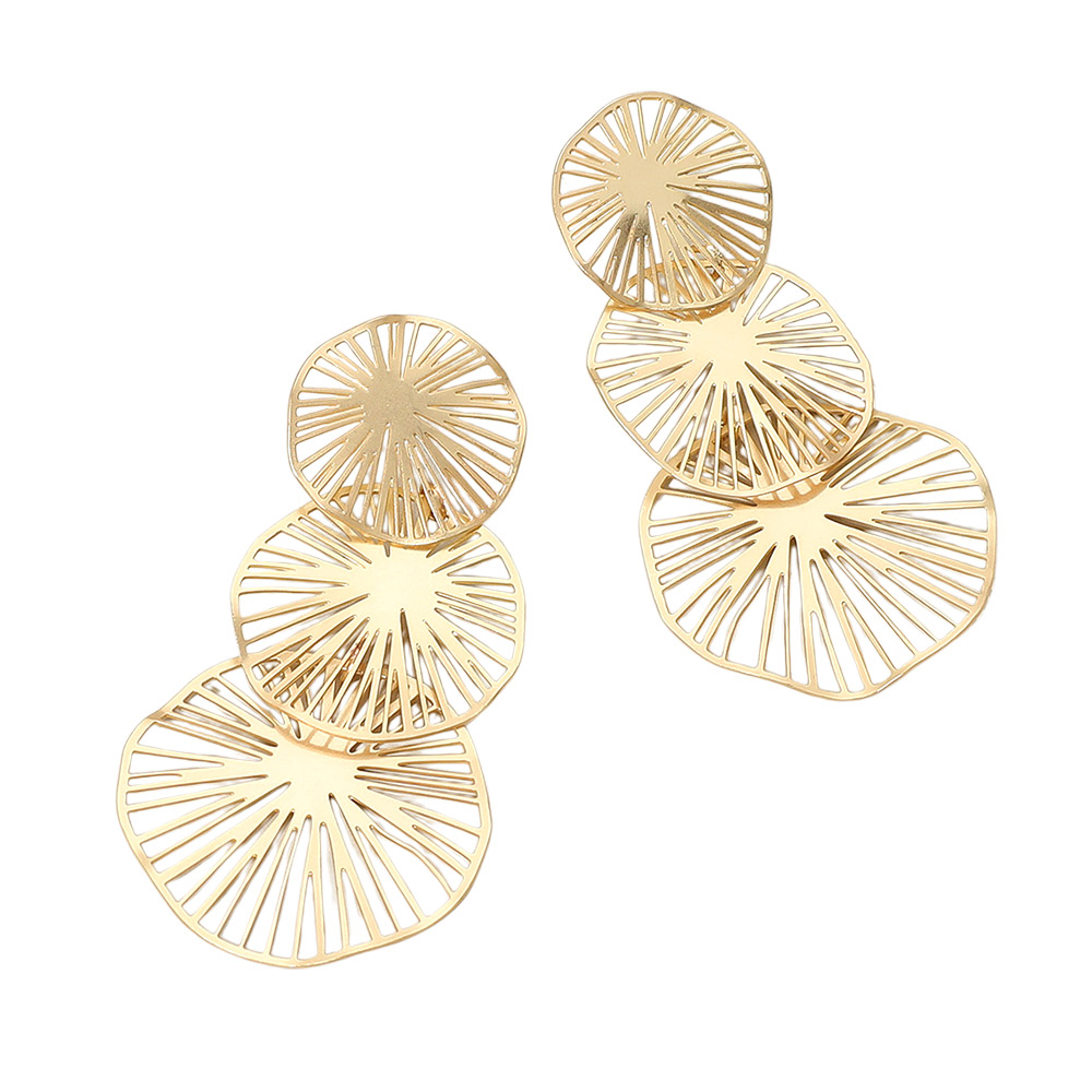 • These layered cutout dangle earrings feature a bold, sculptural silhouette with a radiating line design. Lightweight and statement-making, they're perfect for contemporary looks or artistic ensembles.