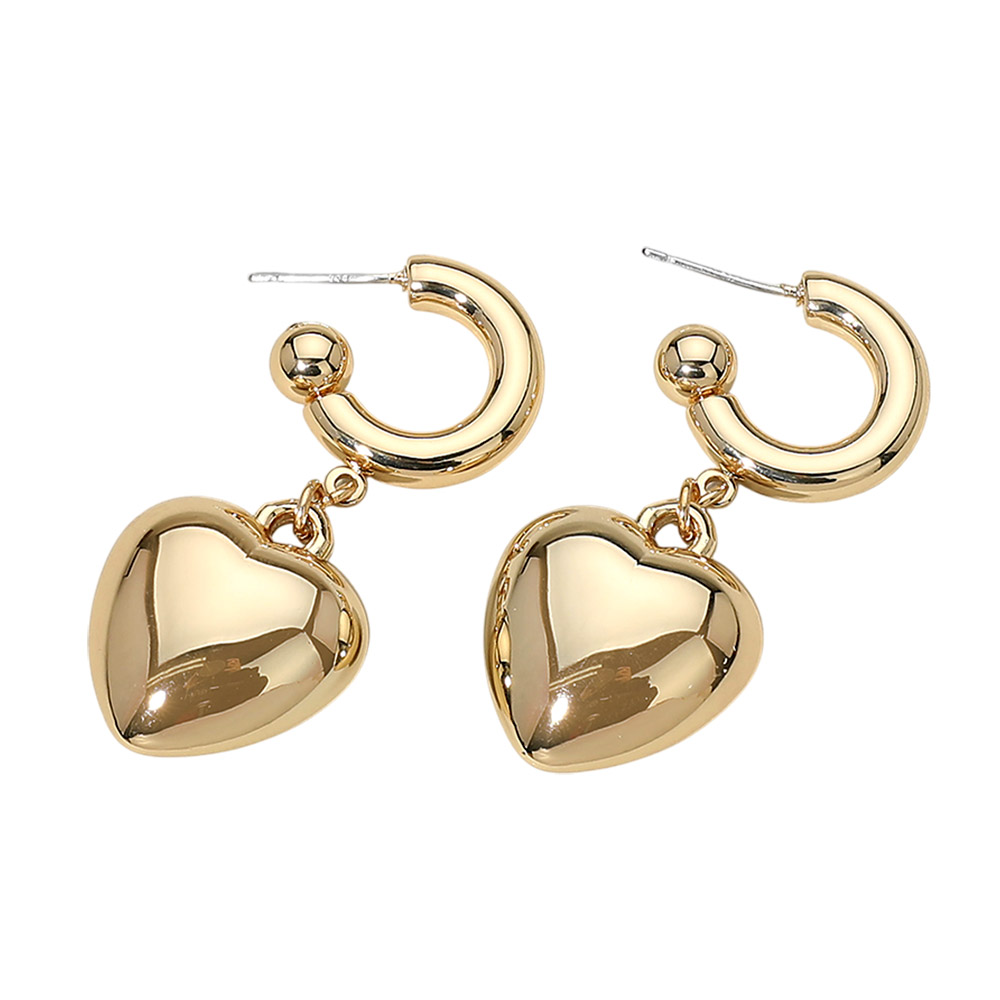 Details • Size : 0.75" X 1.8" • Post Back • These heart charm hoop drop earrings feature a smooth rounded hoop paired with a dangling heart accent for a romantic yet modern look. Designed for everyday wear or special occasions, they add effortless charm to casual outfits, date nights, gifting, and boutique jewelry collections while remaining lightweight and easy to style. • Lead and Nickel Compliant