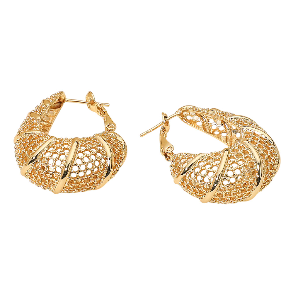 Details • Size : 1.25" X 1.6" • Omega Back • These spiral mesh dome hoop earrings combine openwork detailing with sleek spiral accents for a unique sculptural look. Their bold yet refined design adds texture and depth, making them an ideal accessory to elevate any outfit with modern elegance and timeless sophistication. • Lead and Nickel Compliant